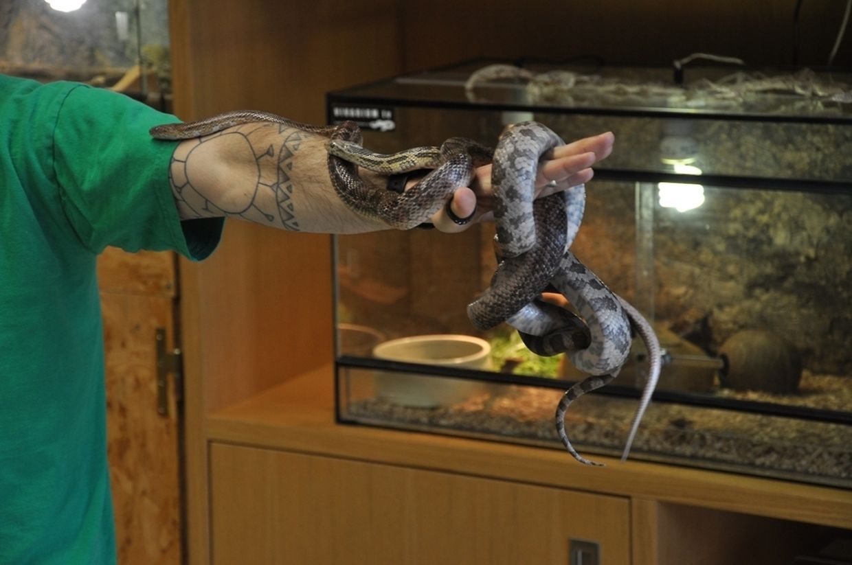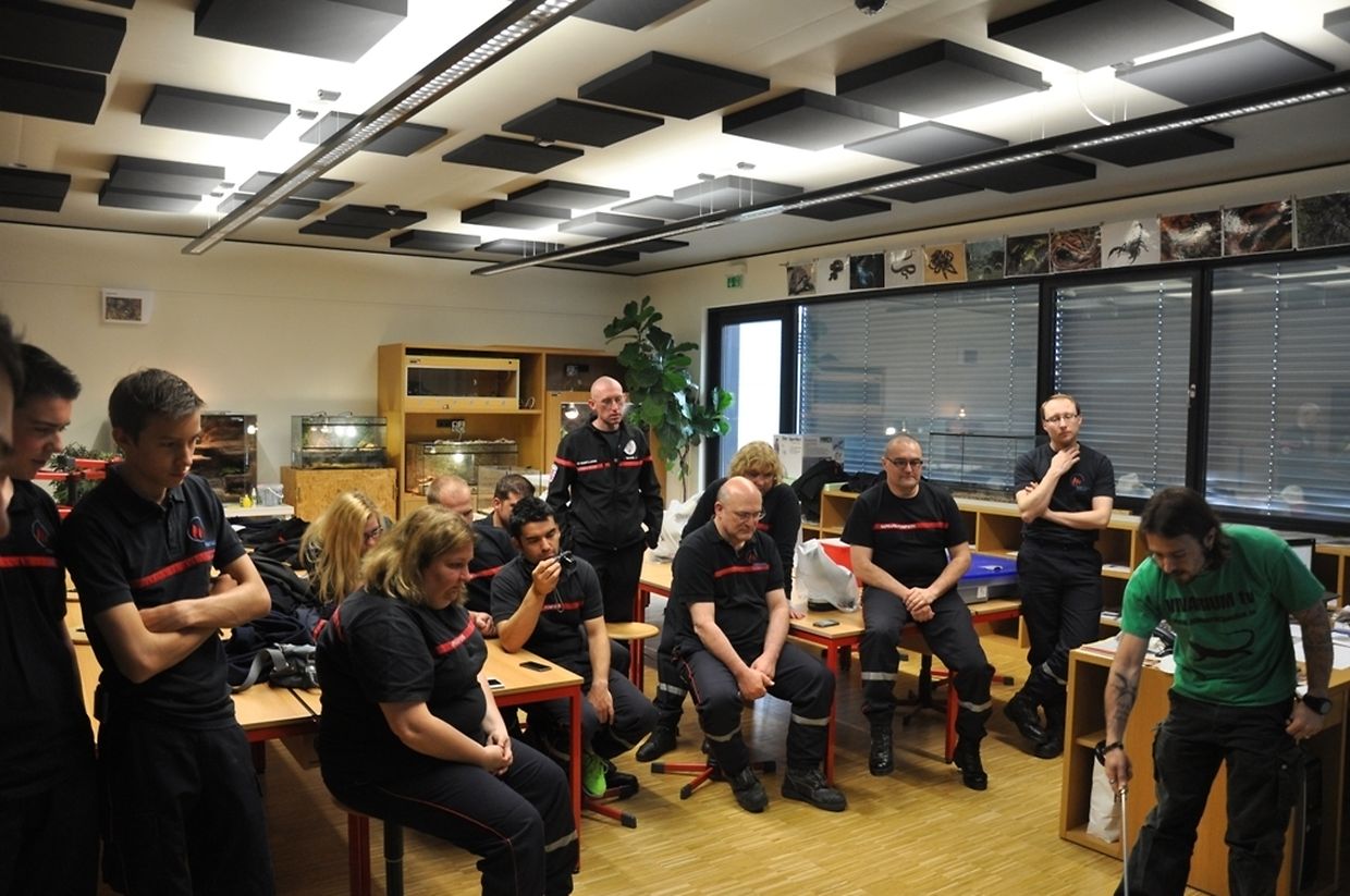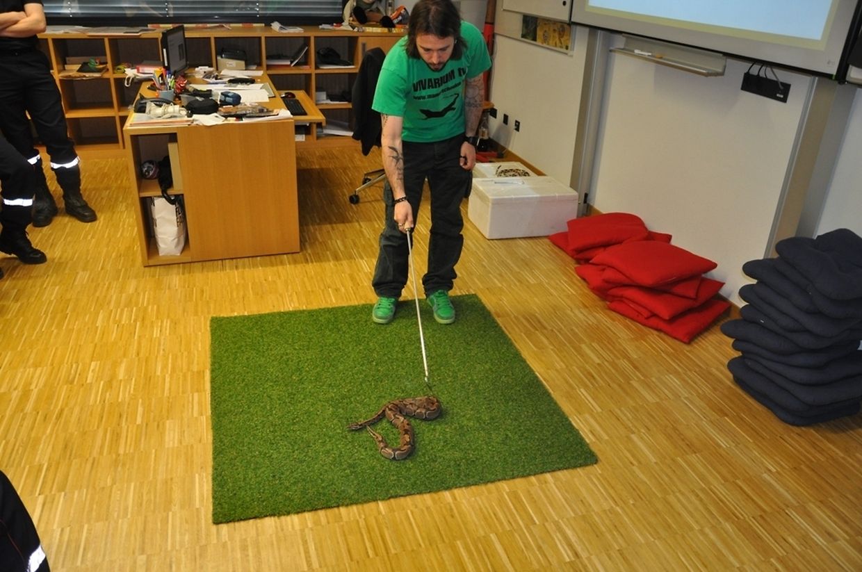 Weydert Gast veranschaulichte mit praktischen Beispielen wie man sich im Einsatz verhalten soll wenn man Schlangen und Spinnen einfangen muss. An verschiedenen Schlangen sowie Vogelspinnen konnte geübt werden und somit die Angst zu den exotischen Reptilien ein wenig gesenkt werden.
