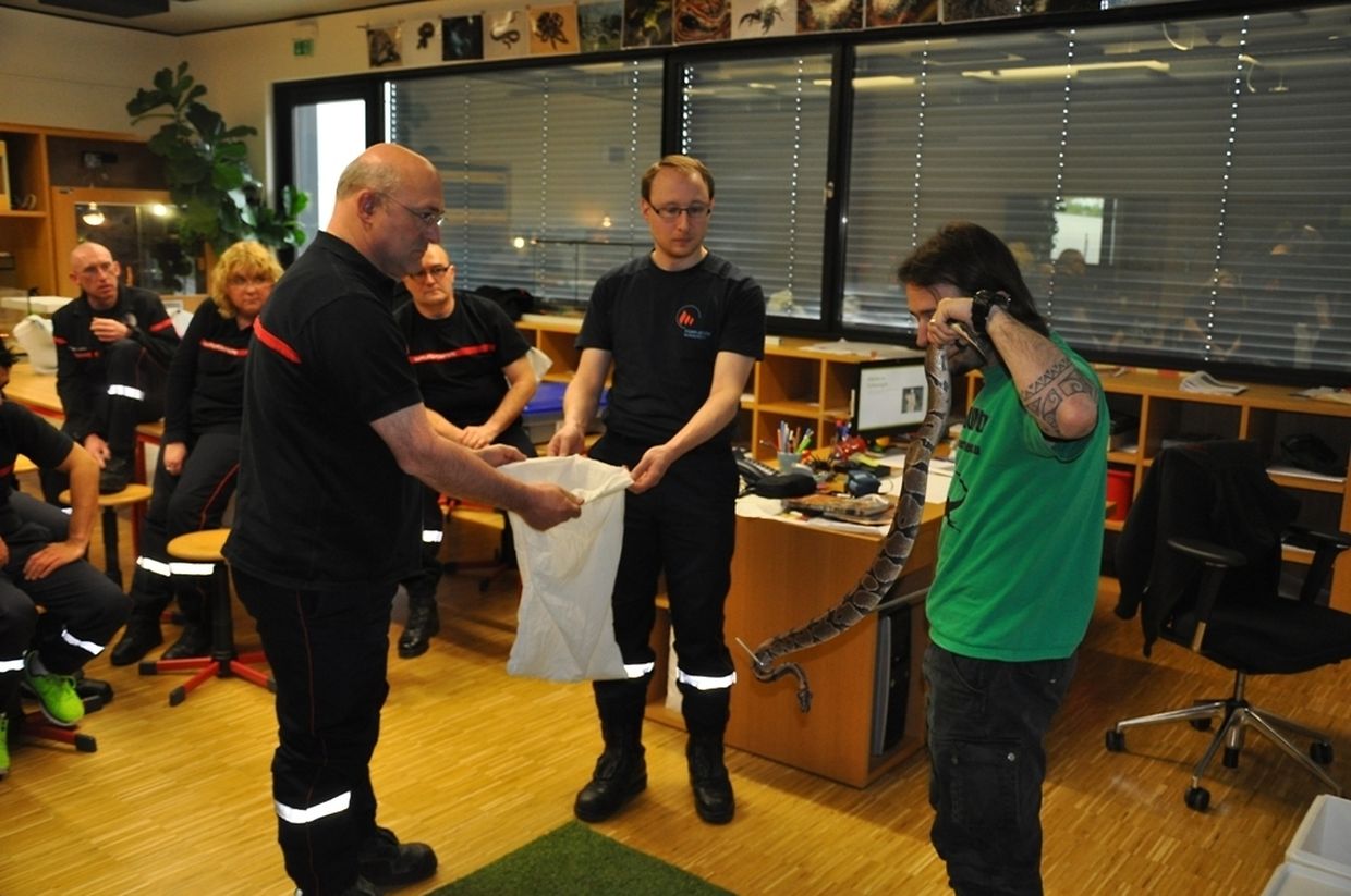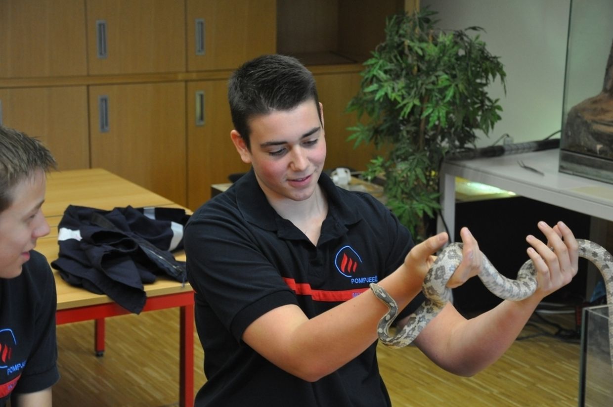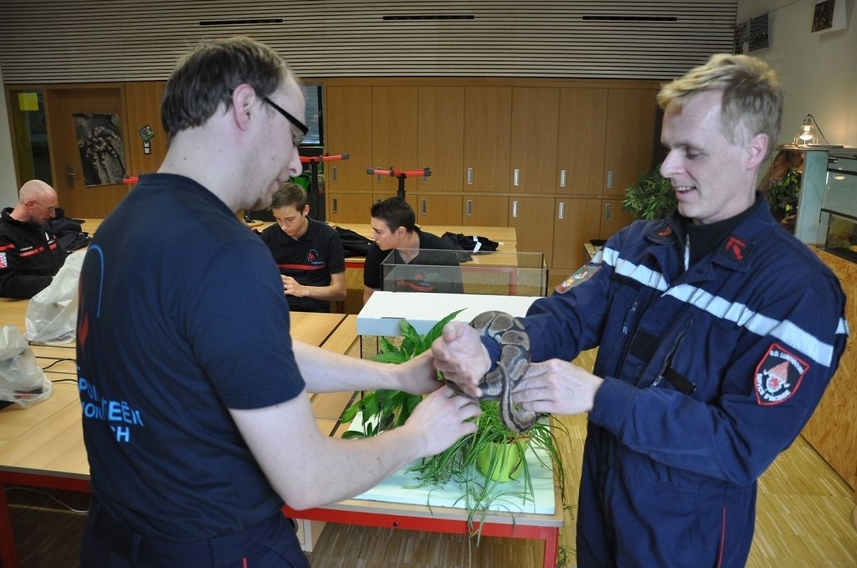 An einer nicht alltäglichen Ausbildung nahmen Mitglieder der Feuerwehr Monnerich und Schifflingen am Samstag teil. Im Vivarium Kinneksbond in Mamer wurde der Umgang mit exotischen Reptilien geübt. Die Feuerwehr Monnerich wurde bereits einige Male alarmiert um Schlangen aus Gartenteichen einzufangen, im Raum Monnerich/Foetz sind Schlangen keine Seltenheit da sich dort ein Feuchtgebiet erstreckt.