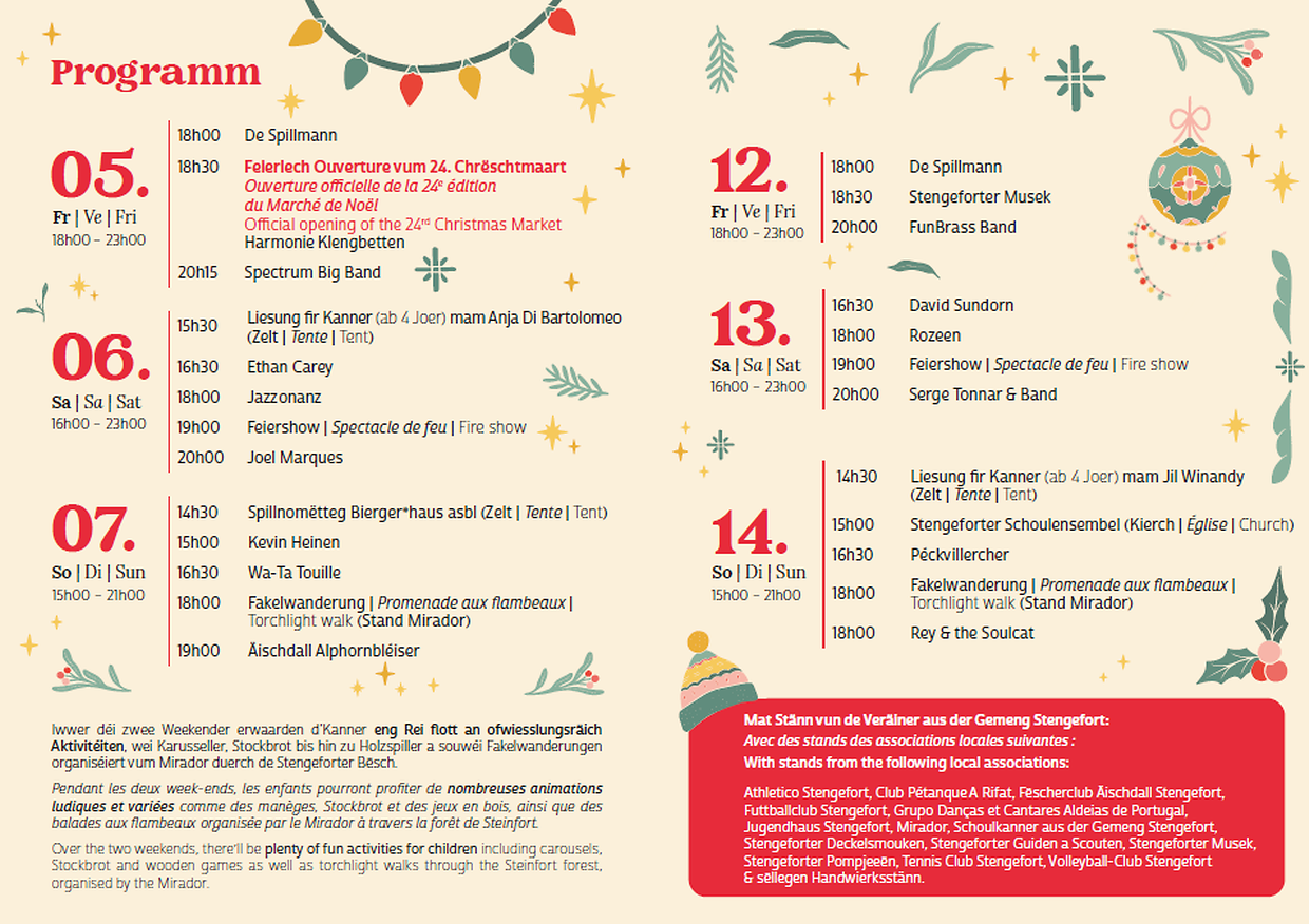 Der Weihnachtsmarkt von Steinfort hat an den Wochenenden vom 5. bis 7. und vom 12. bis 14. Dezember 2025 geöffnet. Freitags von 18:00 bis 23:00 Uhr, samstags von 16:00 bis 23:00 Uhr und sonntags von 15:00 bis 21:00 Uhr können Sie dort in geselliger Atmosphäre bummeln. Wir empfehlen unseren Besucherinnen und Besuchern, für den Weg zu dieser geselligen und festlichen Veranstaltung die öffentlichen Verkehrsmittel zu nutzen.
