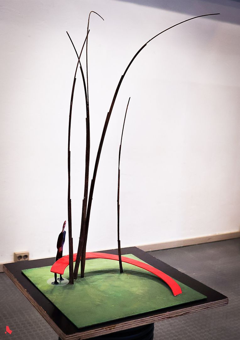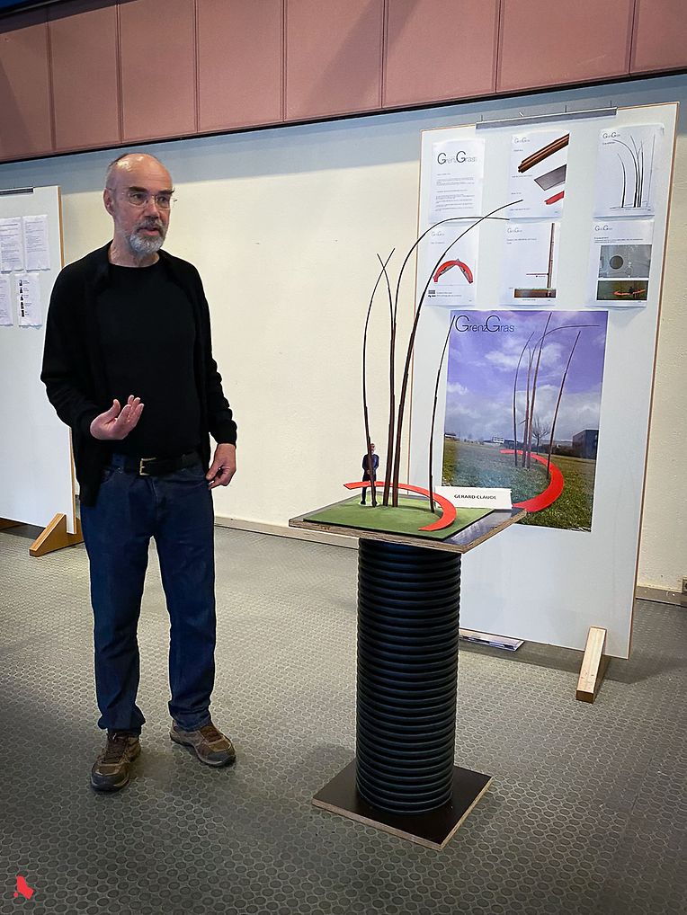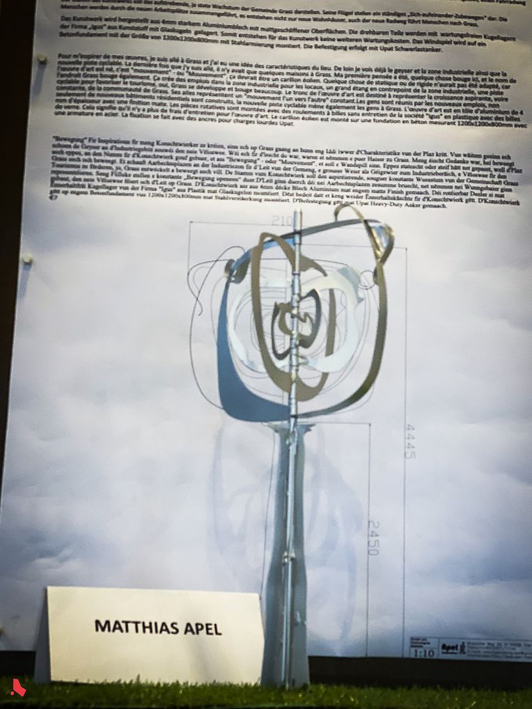 Unter den 7 eingereichten Projekten fiel die Wahl der Jury auf das faszinierende Projekt des luxemburgischen Künstlers Gérard Claude "Grenzgras(s)", eine Skulptur, die eine rein abstrakte Lesart ermöglicht, indem sie durch die Anmut ihrer Stäbe berührt, die sich in eleganten Kurven in den Himmel verjüngen und durch eine rote Horizontale kontrastiert werden. Eine konkretere Lesart ist ebenfalls möglich. Als Material wurde Corteneisen gewählt, das auf die Stahlvergangenheit der Gemeinde verweist. Die Stahlstangen, die so verschweißt sind, dass sie sich nach oben hin verjüngen, stellen das Gras dar, von dem Grass seinen Namen hat. Die rote Horizontale stellt die Grenze zu Belgien dar, die Grass zu einer Halb-Enklave macht. Spaziergänger:innen haben die Möglichkeit, sich auf dem roten Teil, der die Grenze darstellt, niederzulassen und auszuruhen.