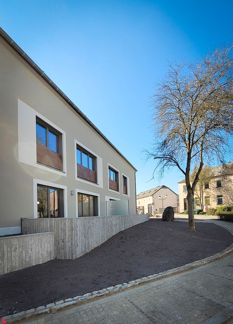 Afin de préserver le caractère rural de Hagen et de valoriser le patrimoine villageois, une architecture classique a été privilégiée pour la conception du bâtiment. Le bureau g+p muller architectes s’est inspiré des volumes, hauteurs et formes des constructions voisines pour intégrer harmonieusement la résidence, dont la façade principale donne sur la place du village. La résidence repose sur une construction mixte : un sous-sol en béton et des étages en ossature bois durable, alliant robustesse et respect de l’environnement. Sur le plan technique, le bâtiment est équipé d’une pompe à chaleur moderne et de panneaux photovoltaïques, garantissant une performance énergétique optimale.