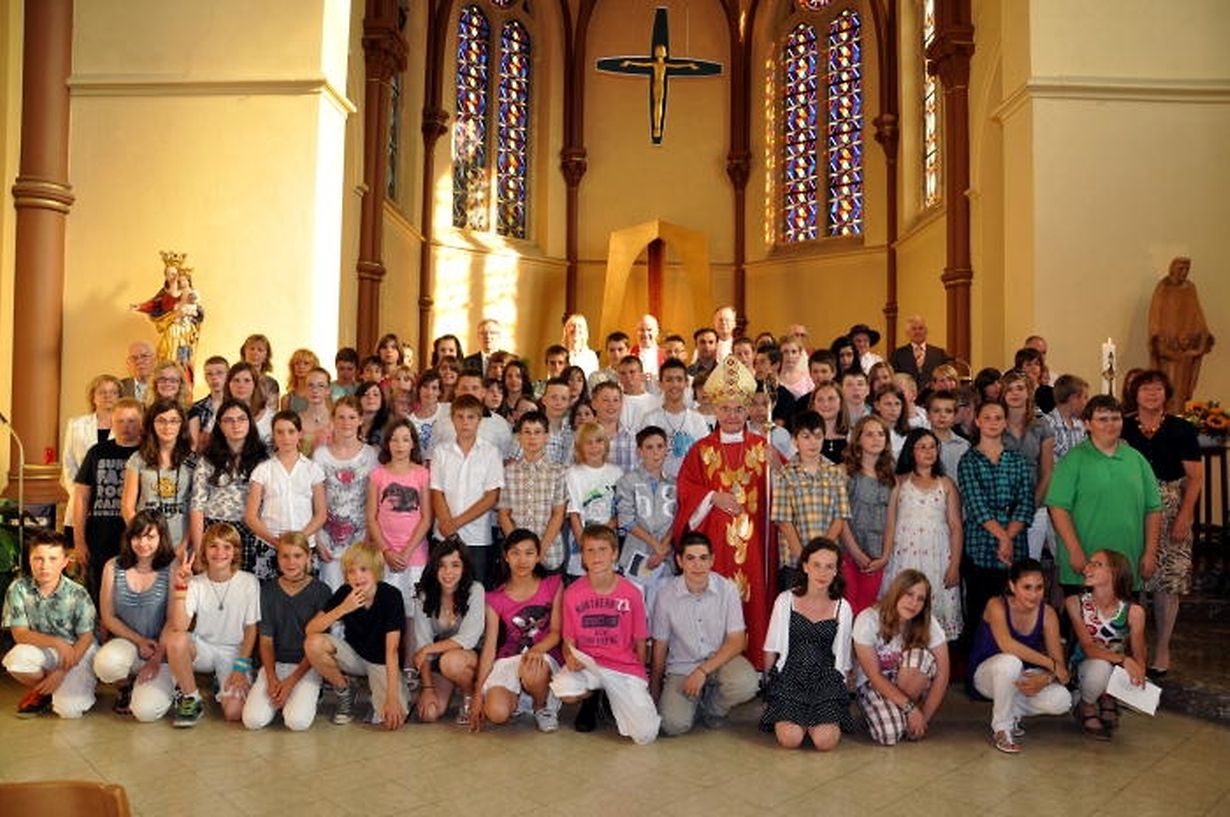 Unter dem Thema „Gottes Geescht hëlleft äis Hoffnungszeeche fir Mensch an Ëmwelt ze ginn“ spendete Erzbischof Mgr. Fernand Franck 72 Jugendlichen und zwei Erwachsenen aus dem Pfarrverband Koerich in Steinfort das Sakrament der Firmung. Bei seinem Eintreffen wurde das Oberhaupt der katholischen Kirche in Luxemburg von Camille Houllard, Präsident der Kirchenfabrik Hagen-Kleinbettingen, begrüßt. Am Altar standen Mgr. Fernand Franck Dechant Théo Klein, Pater Nico Turmes und Pater Alfred Nothum zur Seite. Die Messe wurde gesanglich von den Cäcilienchören Hagen-Kleinbettingen und Steinfort unter der Leitung von Stéphanie Ortega und von den Firmlingen unter der Leitung von Josée-Anne Mangen verschönert. Zum Schluss der Feier wurden die Firmlinge der Pfarreien Eischen und Hobscheid von ihren Patinnen Marie-Paule Schmit und Gilbert Weis, der Pfarrei Hagen-Kleinbettingen von Anny Thill-Houllard, der Pfarrei Koerich von Nathalie Biver und Fernand Lux und der Pfarrei Steinfort von Barbara Galuza-Krijom und Thierry Feiereisen mit Geschenken bedacht. (text/FOTO: CORYSE MULLER)