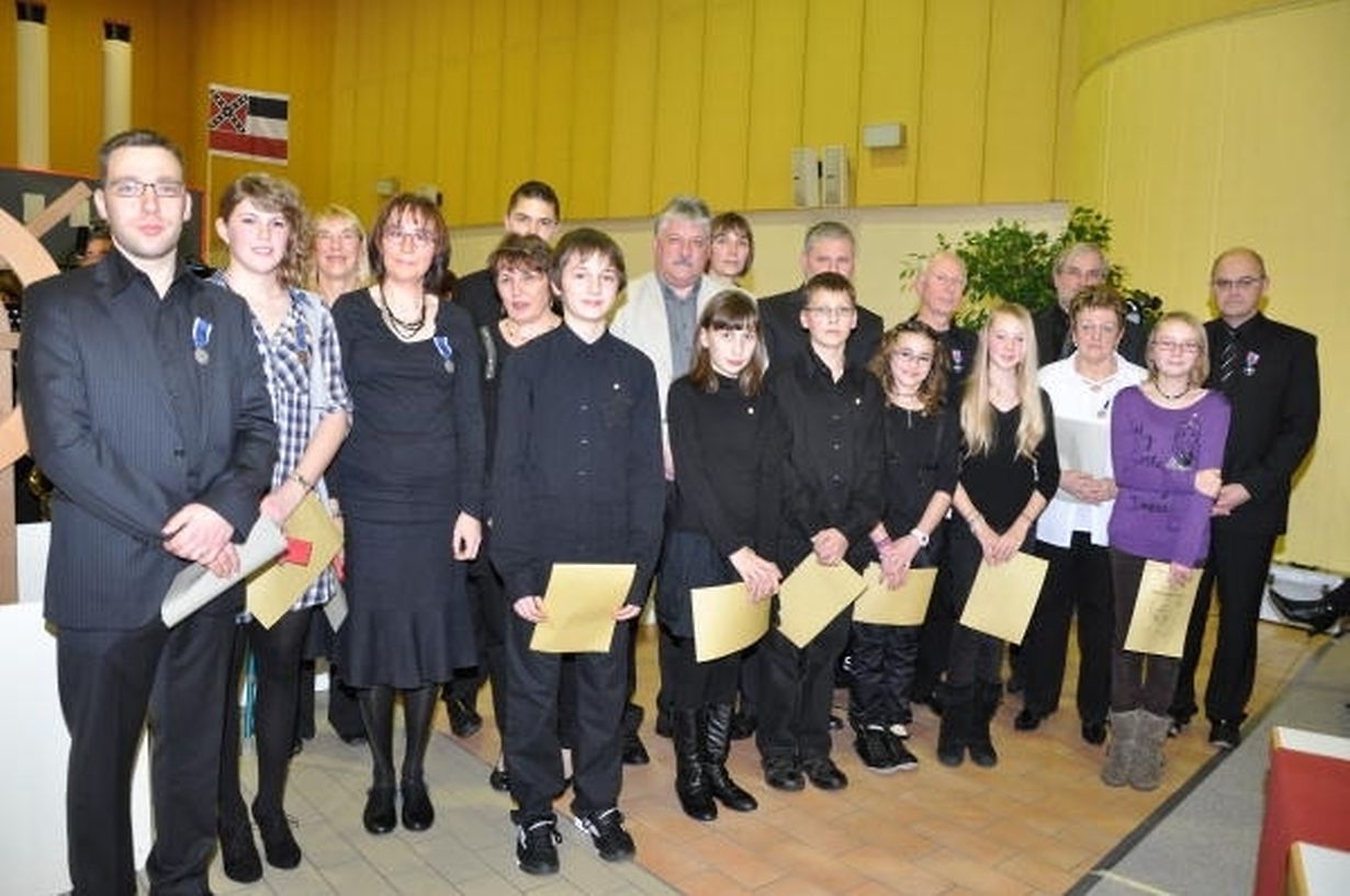 Traditionsgemäß wurden während der Konzertpause langjährige und verdienstvolle Mitglieder mit Ugda-Medaillen ausgezeichnet. Verbunden mit den besten Glückwünschen von Bürgermeister Guy Pettinger, dem regionalen Ugda-Delegierten Romain Ries und Präsident Jean-Pierre Beffort wurde Johny Heiderscheid und Roland Linster ein silbernes Verdienstkreuz verliehen. Annie Houllard, Thérèse Krecké, Marianne Meyers und Jeff Ries wurden für ihre 20-jährige Vereinstreue mit einer Silbermedaille geehrt. Mit einer Bronzemedaille (zehn Jahre) wurden Magali Hartmann und Michel Linster ausgezeichnet und je eine Verdienstnadel (fünf Jahre) erhielten Manon André, Lydia Da Silva Goncalves, Axelle Dekelver, Gritty Feiereisen-Goebel, Sven Paulus, Lone Salvatore, Niels Salvatore und Danielle Thill. (rfg)