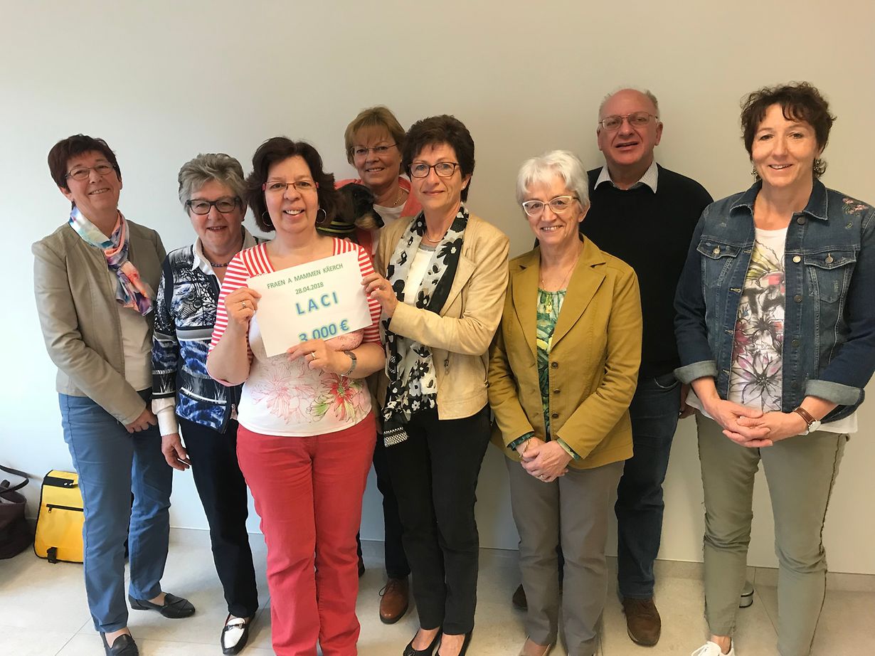 Jedes Jahr kommen im Durchschnitt in Luxemburg 4 taube Kinder zur Welt. Seit etwa 20 Jahren werden diese Kinder mit Cochlear Implantaten versorgt, die es ihnen ermöglichen, zu hören, am Regelunterricht teilzunehmen und später ein annährend normales Erwachsenenleben zu führen. Auch Erwachsene, die später ertaubt sind oder Schwerhörige können dank der Cochlear-Implantate wieder besser hören. LACI, die Vereinigung der CI-Träger Luxemburgs, vertritt die Interessen dieser kleinen Gemeinschaft und fördert den Austausch von Erfahrungen untereinander. Mit Freude und Dankbarkeit konnte der Verwaltungsrat der LACI kürzlich bei einem Empfang in den Räumlichkeiten der Hörberatung in Steinsel die groβzügige Summe von 3.000€ entgegennehmen, die die Sektion Koerich der Action Catholique des Femmes Luxembourgeoises anlässlich ihres traditionellen „Familljendag“ sammeln konnte. Das Geld wird unter anderem dafür genutzt, hörgeschädigten, implantierten und hörenden Kindern während des Sommerfestes der Gemeinschaft der Hörgeschädigten am kommenden 9. Juni in Steinsel einen Workshop mit der Zirkusschule Zaltimbanq‘ zu finanzieren. Foto: Yvette Grethen, Marie-Claire Muller, José Kroemmer und Aline Mangen von den Fraen a Mamme Käerch bei der Überreichung der 3.000€ an den Vorstand der LACI, vertreten durch Viviane Fautsch, Chantal Kern, Christiane Forgiarini, Jacques Bruch und Philippe Eschenauer (nicht auf dem Bild)