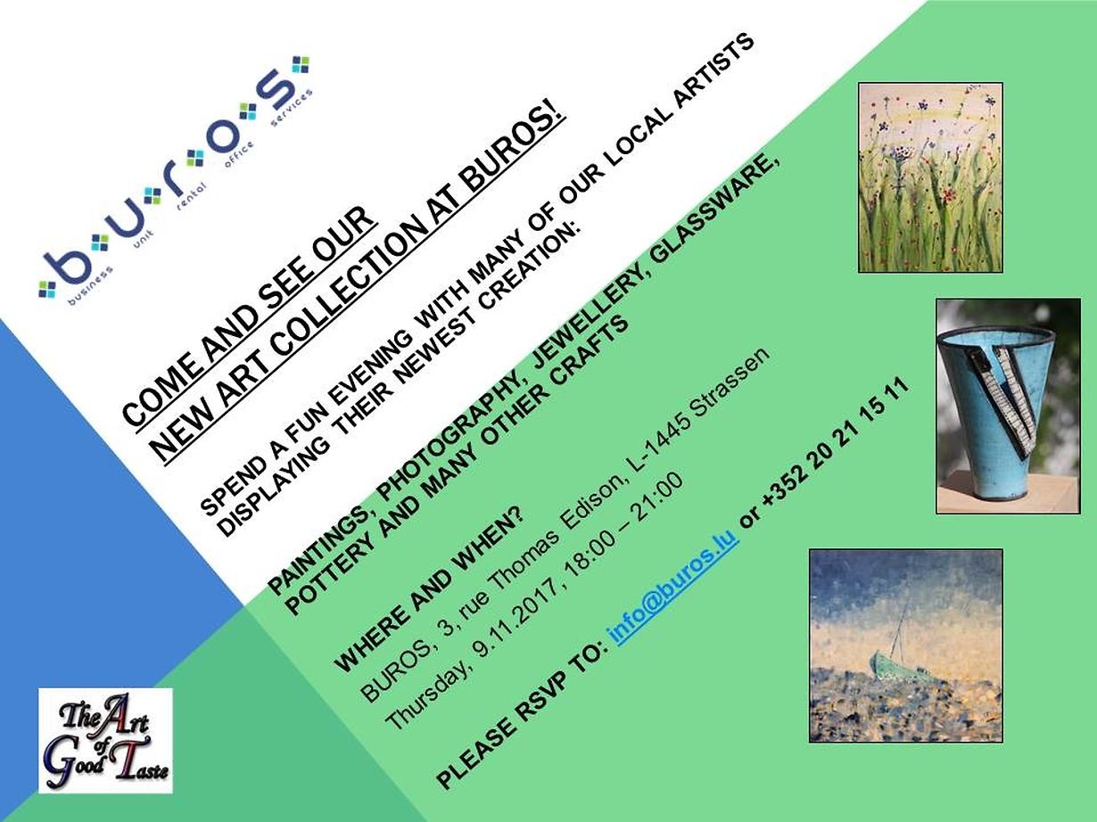 Strassen BUROS Art Event 09 Nov 2017 09 Nov Mehr 09 Nov Nicole St Veröffentlicht am Freitag, 13. Oktober 2017 um 10:43 3 Rue Thomas Edison, 1445 Strassen, Luxemburg Come and see our new Art Collection at BUROS! Spend a fun evening with many of our local artists displaying their newest creation: paintings, photography, jewellery; glassware, pottery and many other crafts Unpassenden Inhalt angeben