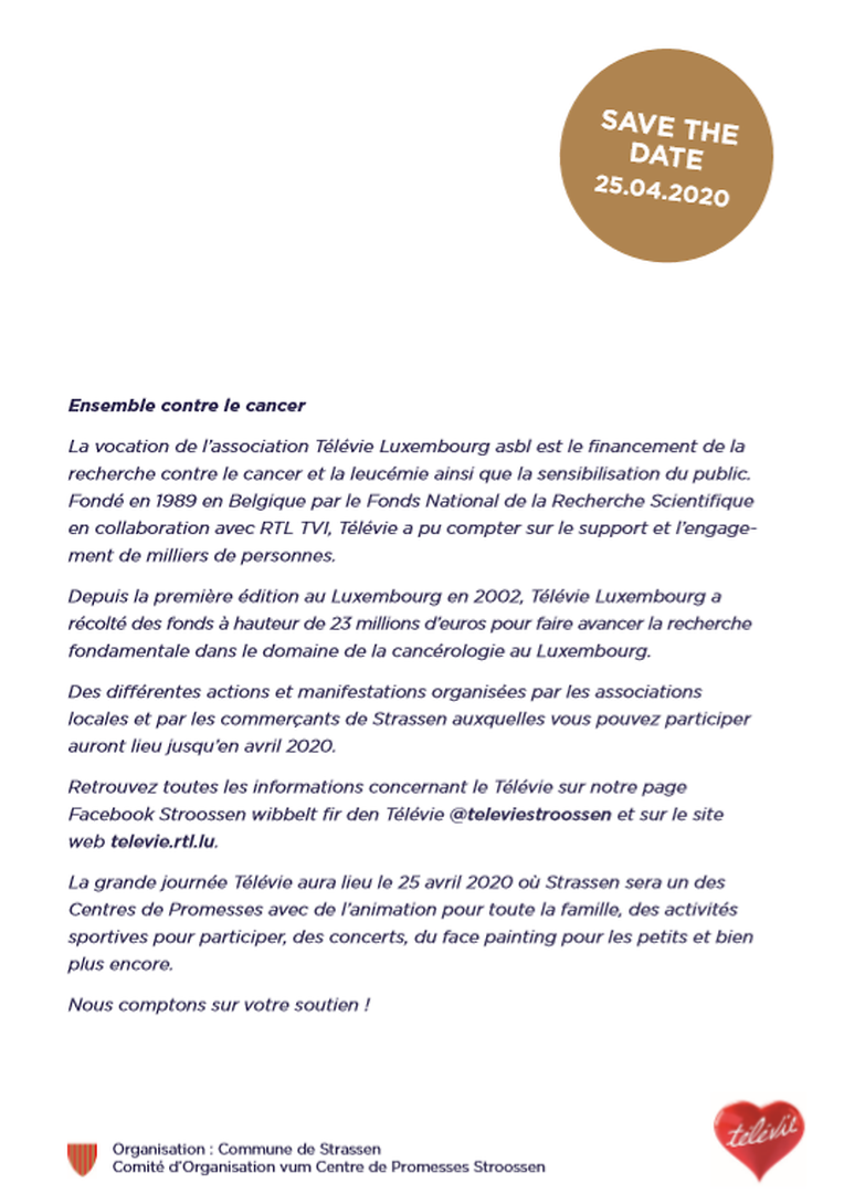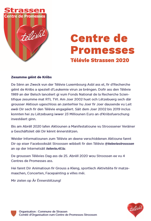 De groussen Télévies Dag ass de 25. Abrëll 2020 wou Stroossen ee vu 4 Centres de Promesses ass.