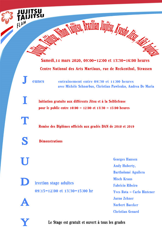 Am Samstag, den 14. März zwischen 09:00 und 12:00, sowie 13:30 und 15:00 Uhr treffen sich Jitsukas aus den 13 FLAM/Jitsu-Vereinen im Centre National des Arts Martaux in Strassen, rue de Reckenthal zu einem gemeinsamen Lehrgang.