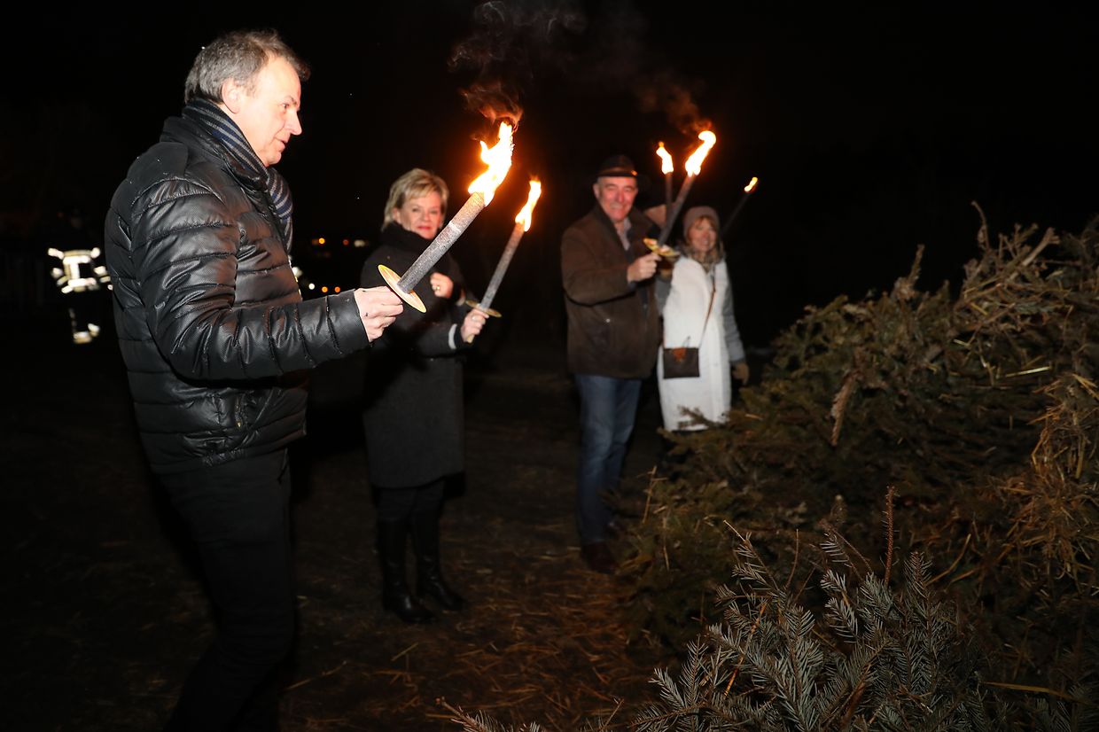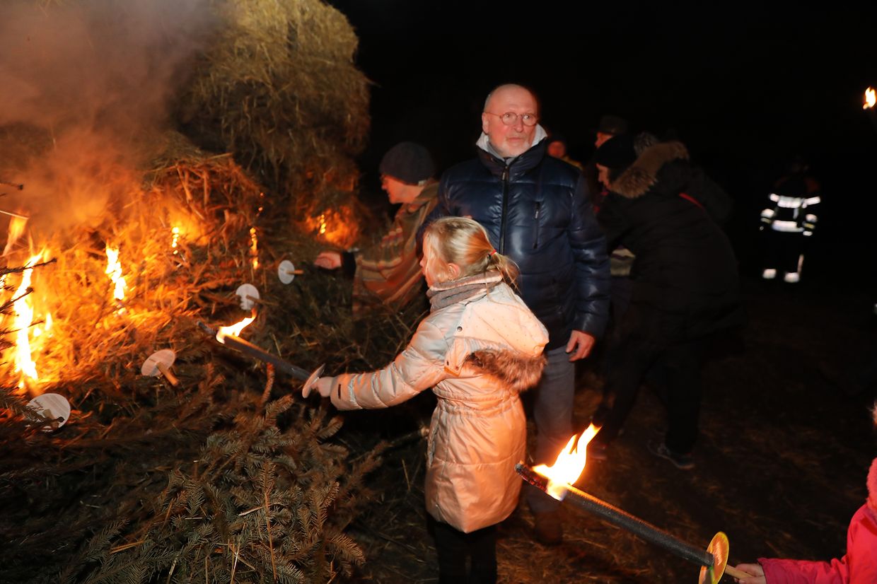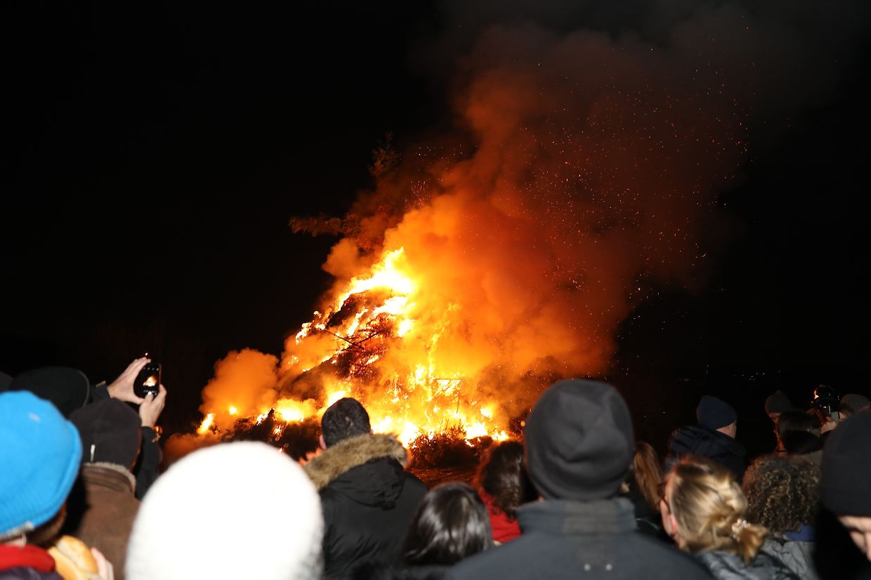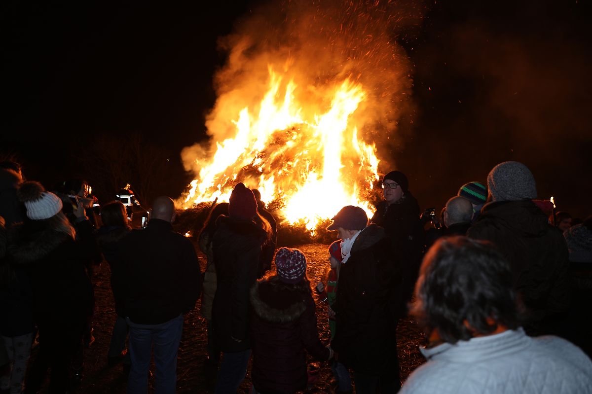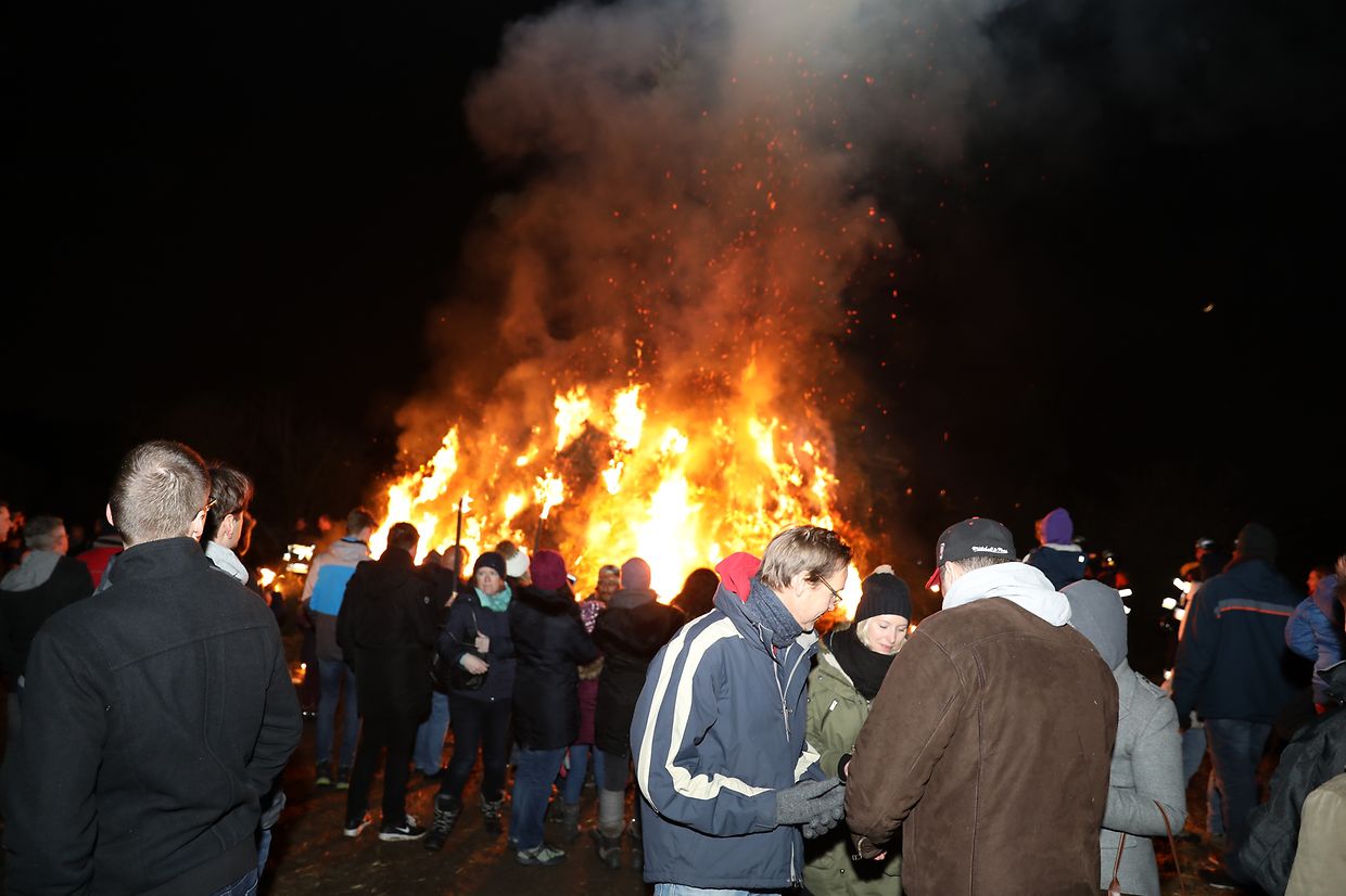 Strassen: Auf Einladung des Schöffen- und Gemeinderates sowie der Sports- und Vereinskommission fand traditionsgemäß am ersten Sonntag nach der Fastnacht das Burgbrennen statt, wobei mit dem Feuer zur Zeit des Frühlingsanfangs symbolisch der „Winter verbrannt“ und ein guter Sommer heraufbeschworen werden soll. Ein imposantes Bild ergab der Festzug, der sich im Schein vieler Fackeln und unter den Marschklängen der „Fanfare Stroossen“ durch die rue des carrieres aufs offene Feld bewegte, wo die lokalen Gemeindedienste eine eindrucksvolle „Burg“ mit Kreuz aufgebaut hatten. Zusammen mit Schöffen Nico Pündel und den Gemeinderäten Martine Dieschburg und Laurent Glesener entzündeten die seit kurzem verheirateten Nathalie und Jerry Thomas das Feuer, dessen Flammen hoch aufleuchteten und rotglühende Funken über die dunklen Felder sprühten.