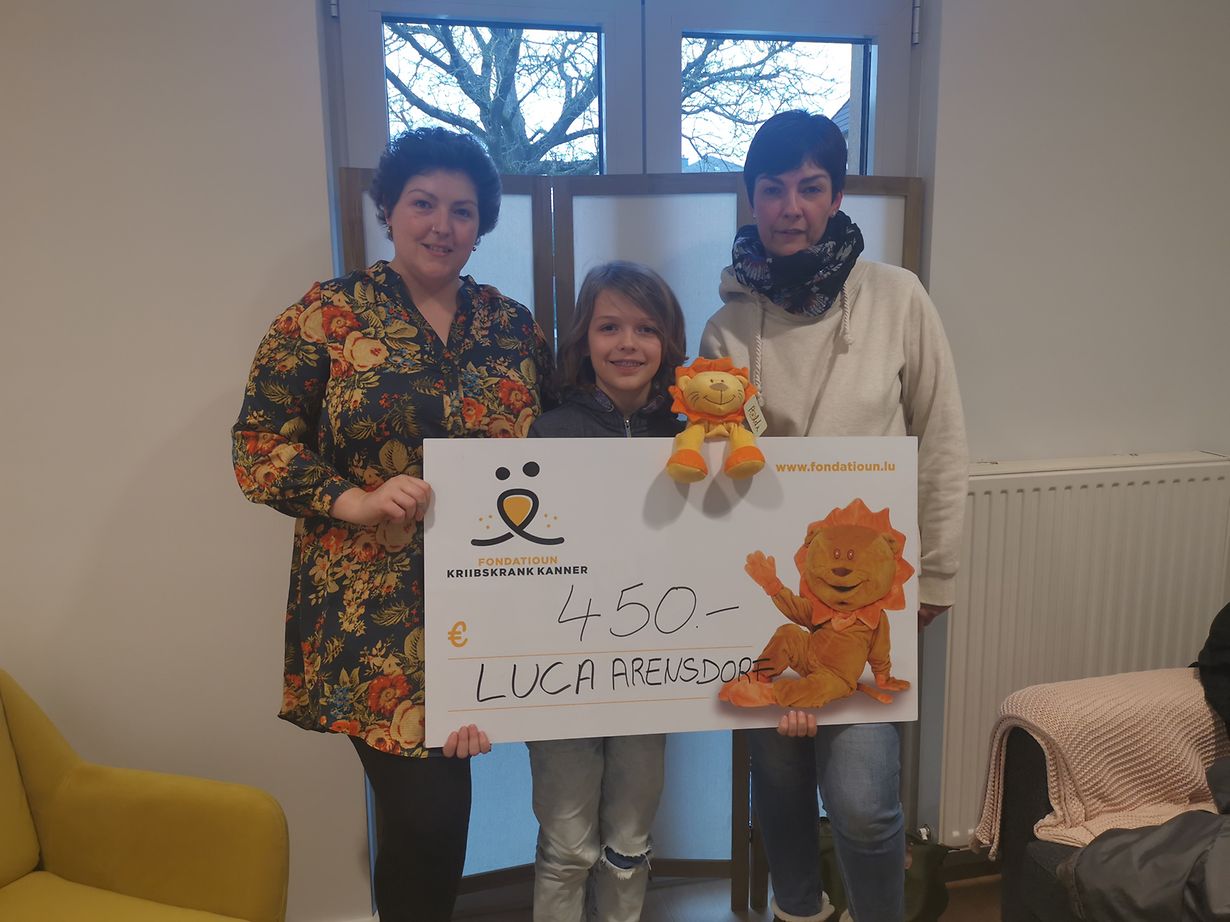 De Luca Arensdorf ass ee Jong vun 10 Joer deen een ganzt grousst Häerz huet. Hien huet sech an sengem jonken Alter schonn mam Thema Kriibs auserneen gesat. De Luca wollt de Kanner hëllefen deenen et leider net esou gutt geet. Hien huet mat senger Mamm der Mme Sheila Fanelli , senger Giedel an der Boma seng Auto verkaf mat deenen hien net méi gespillt huet, mee awer och fir Chrëschtdeeg mat der Famill Arrangementer gebastelt déi dunn och all verkaf ginn sinn. De Luca an seng Famill hunn dunn hir Kollekte vun 450.-€ un Fondatioun Kriibskrank Kanner gespent.