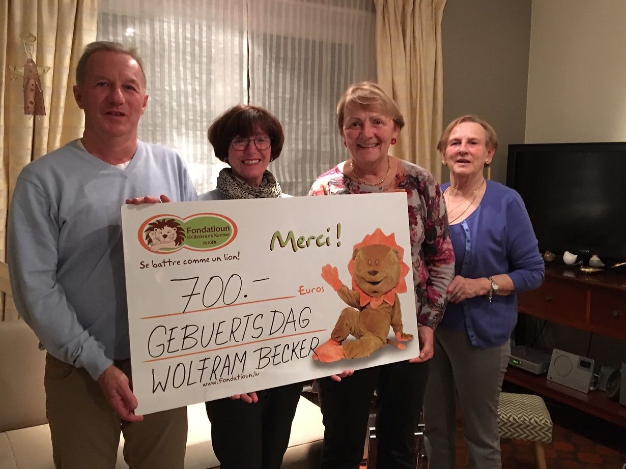 Strassen Den Här Becker spend 700.-€ fir Fondatioun Kriibskrank Kanner De Poldi Veröffentlicht am Dienstag, 4. Dezember 2018 um 13:17 Strassen, Luxemburg Fir dëse Gebuertsdag wollt den Här Wolfram Becker kéng Kaddoen an dat zu Gonschten fir Fondatioun Kriibskrank Kanner. Den Här Becker huet der Fondatioun Kriibskrank Kanner een Scheck iwwerreescht an héicht vun 700.-€ Unpassenden Inhalt angeben Weitere Neuigkeiten von De Poldi > De Kannerrot vun Rëmerschen spend 517 € un d'Fondatioun Kriibskrank Kanner 13.08.24 Remerschen La Table Ronde de Luxembourg collecte 29.600 € pour la bonne cause 13.08.24 Strassen Arcus Infrastructure Partners soutient la Fondatioun Kriibskrank Kanner 13.08.24 Luxemburg - Kirchberg D'Grondschoul vu Lënster iwwerreecht ee Scheck vu 24.237,98€ 22.07.24 Junglinster De Crochet solidaire spent fir d'Recherche am Kannerkriibs ze ënnerstëtzen 22.07.24 Strassen