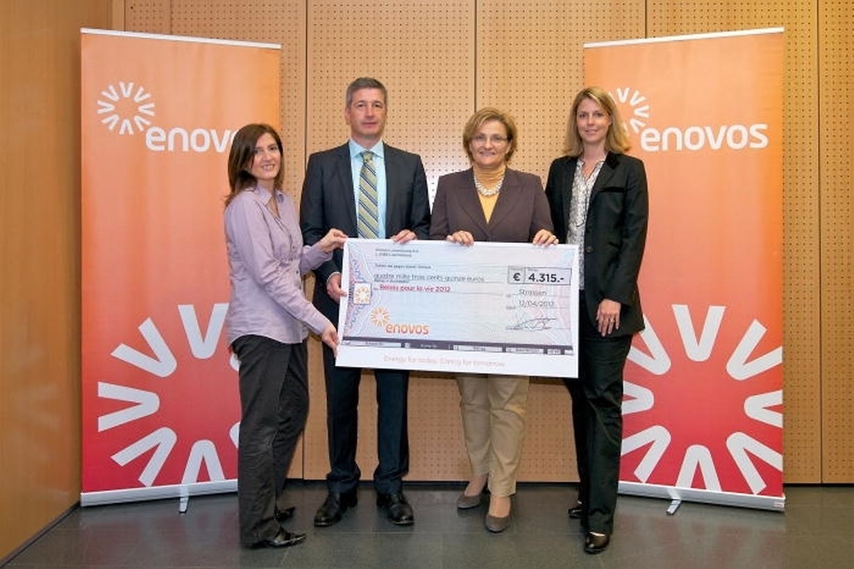 Comme chaque année, le fournisseur d'énergie Enovos soutient le Relais pour la vie de la Fondation Cancer. Enovos Luxembourg S.A., représenté par Erny Huberty, responsable du service marketing et Danny Manso, responsable du service communication, a remis un chèque de 4.315 euros à Marie-Paule Prost, directrice de la Fondation Cancer.