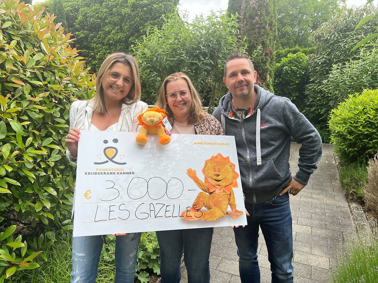 Au bout d'un an de préparation, d'organisation de divers évènements tels que souper, concerts ou autre endurance de karting mais aussi et surtout grâce à tous nos sponsors qui ont cru en nous et en notre projet, nous avons pu récolter 3.000€ de plus que nous sommes fières de reverser aujourd'hui à la Fondatioun Kriibskrank Kanner.