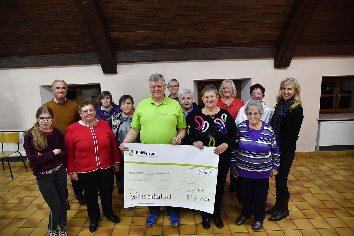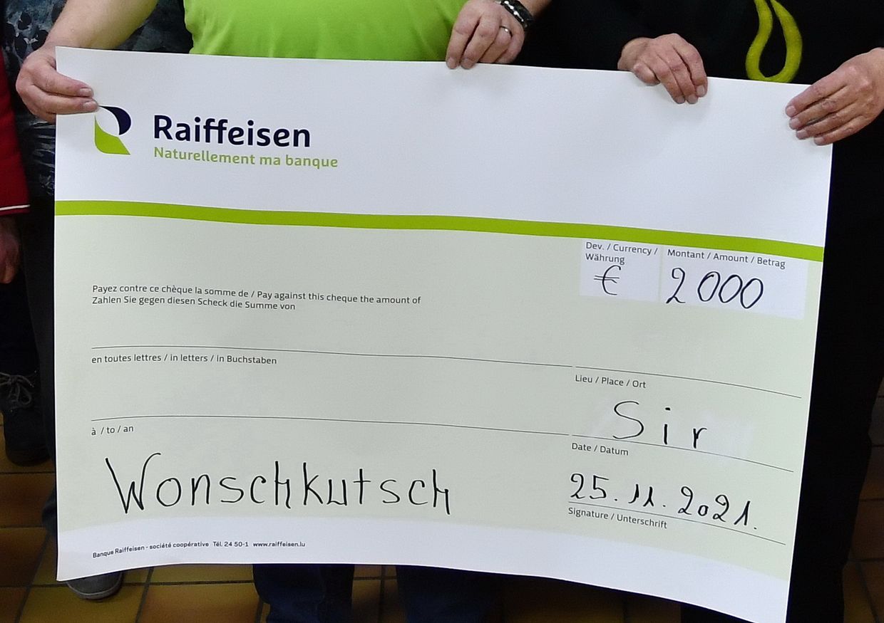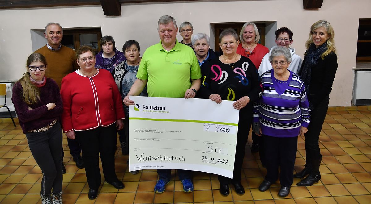 Sir: Viru kurzem hun d’Frae vu Sir sech vun hierer bëschter Säit gewissen. Am Kader vun enger klenger Feierstonn am Festsall vu Sir hun di eifrig Fraen aus der Uertschaft nämlich e Scheck, nieft enger weiderer Spend, dat den Erléis vun hirem Hierkenowend am Oktober 2019 duerstellt, weidergin. Agangs huet sech d’Presidentin Jeanny Reisen bei alle Memberen a Comitésläit fir hirt freiwëllegt Engagement, haerzlech bedankt. Pandemie Bedingt konnt bis auf Weiteres keng Veranstaltung organiséiert gin, mat der Hoffnung dat an Zukunft och nach besser Zäiten fir all Laït nach komme waerten. Mat engem ofrichtige Merci konnte de Matthieu De Dood e Scheck iwert 2 000 Euro entgéint huelen, den der Vereenegung „Wonschkutsch“ zugut komme waert . A kurze Wieder huet hien d’Vereenegung virgestallt déi zënter ronn véier Joer besteht mat dem Ziel Mënschen déi an enger palliativer Situatioun sin, an ënnert enger schwéierer an onheelbarer Krankeheet leiden, e läschte Wonsch ze erfëllen. Si organiséirern den Transport je no Gesondheetszoustand mat denen passenden Mëttelen un, déi och vu ausgebildeten Fräiwëllegen betreit gin. Och de Paschtouer Marco Wehles huet Merci gesoot fir di generéiss Spend, wou e Käerzestänner fir Votivkäerzen, engt neit Messgewand mat enger Stola konnten ugeschaaft gin. Am Numm vun der Gemeng Bauschelt huet d’Félicie Reuter de Fraen vu Sir fir d‘Initativ an hirt Engagement hire Luew a Respekt, ausgesprach. (CR)(Foto: Charles Reiser)