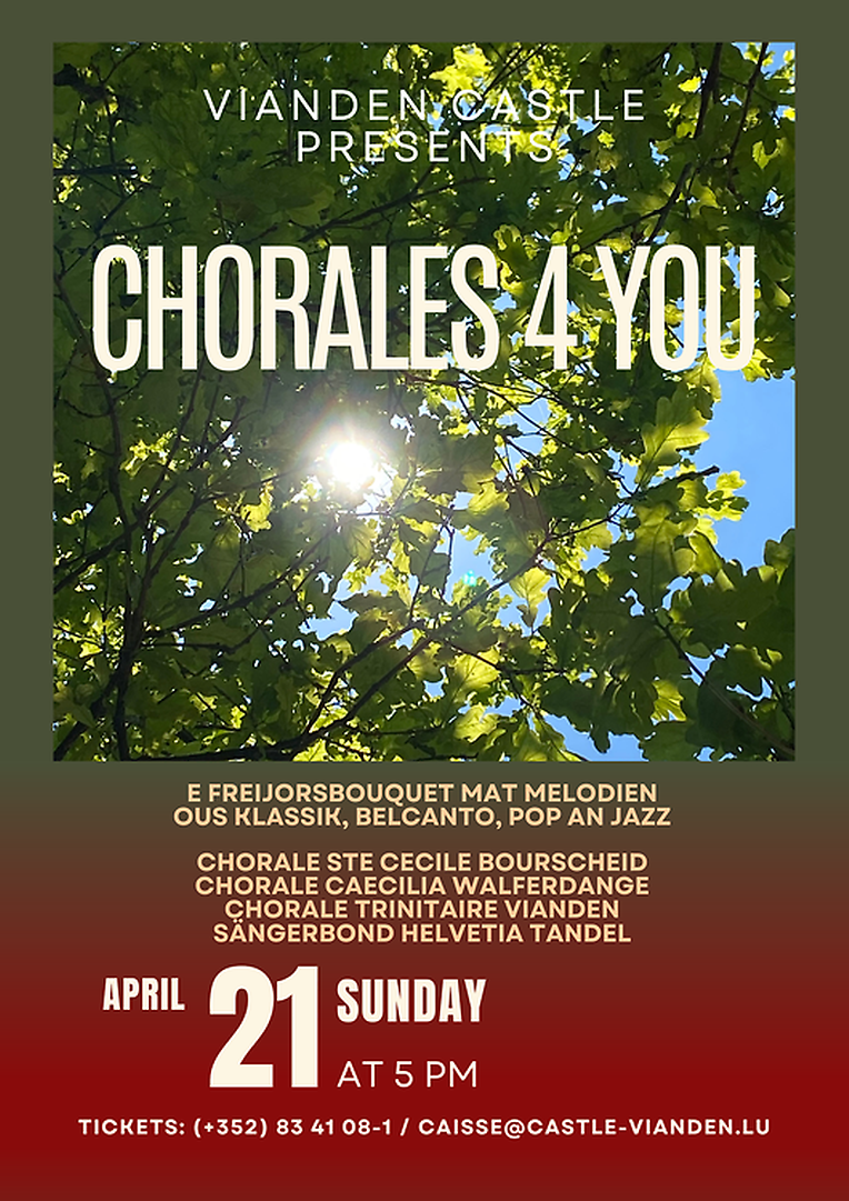 Unser nächstes Projekt: „CHORALES 4 YOU“ am 21. April um 17.00 Uhr auf Schloss Vianden, ein Frühlingsblumenstrauß mit Melodien aus Klassik, Belcanto, Pop und Jazz zusammen mit den Chören aus Walferdingen, Bourscheid, Vianden und natürlich dem Sängerbond HELVETIA.