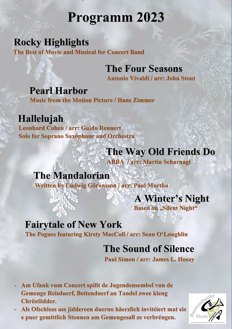Samsdes, de 16. Dezember 2023 um 19.30 Auer an der Kierch zu Baastenduerf. Mat derbäi ass dest Jar de Jugendensembel aus de Gemengen Reisduerf, Tandel a Bettenduerf. Den detailéierten musikaliche Programm fann Dir op eisem Flyer. D´Baastenduerfer Musik steet ënnert der Direktioun vum Maxim Volgin. Duerno ass jiddereen häerzlich invitéiert mat éis e puer gemittlich Stonne am Gemengesall ze verbréngen. An der Hoffnung Iech deen Owend bei éis begréissen ze kënnen, verbleiwen mat musikaliche Gréiss. D´Baastenduerfer Musik