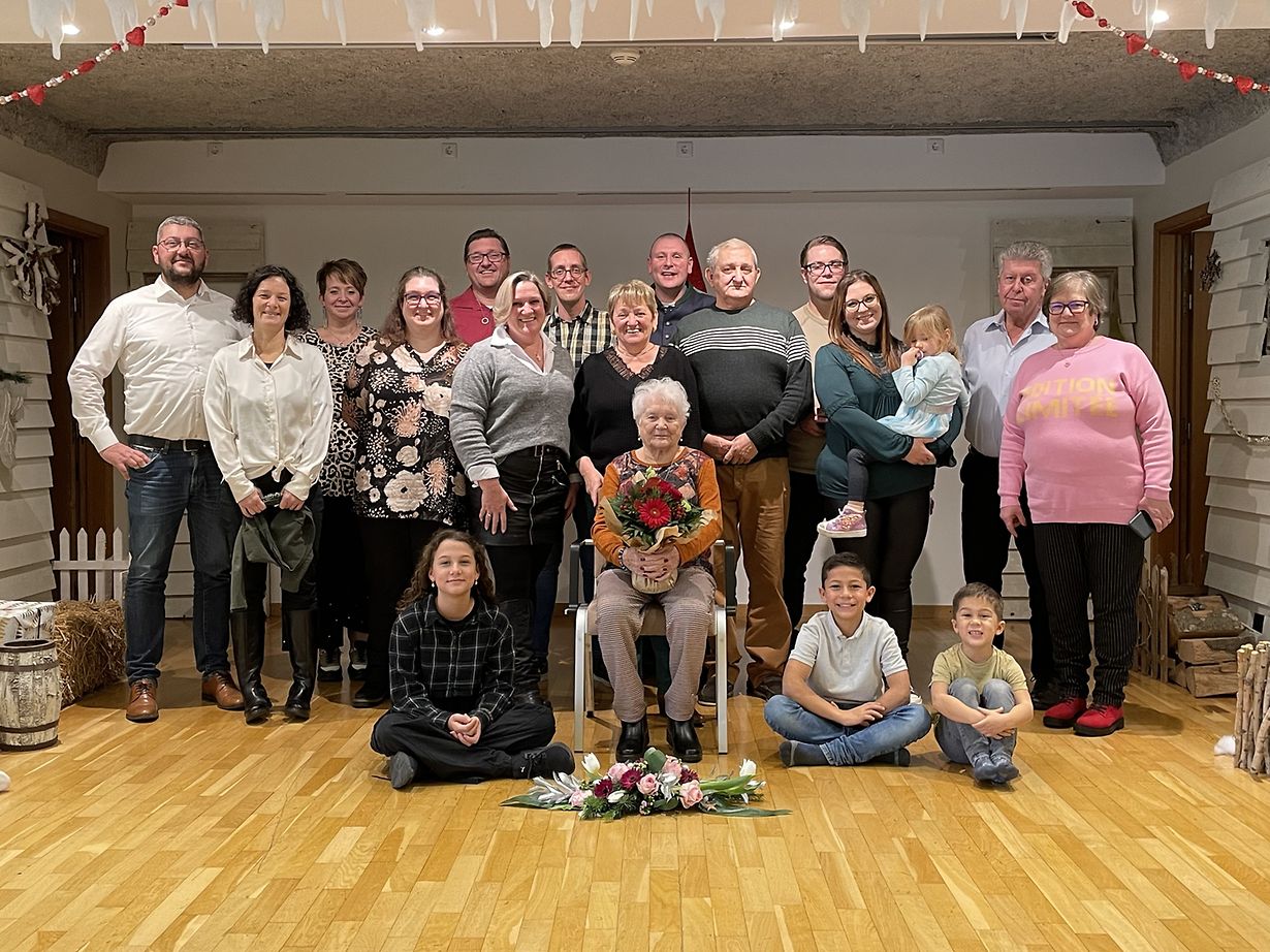 TÉITENG: Virun kuerzer d’Zäit, den 11. Dezember 2022, huet d’Madamm Jeanny TINTINGER-BREMER hir 90 Joer krit. Zu dësem Jubiläum hunn sech zu BEETEBUERG am Altersheem „AN DEN WISEN“ d’Famill versammelt fir d’Jeanny z’iwwerraschen. Hir Kanner, Enkelen an Ur-Enkelen hunn sech mat hir gefreet fir dësen 90. Gebuertsdag ze feieren. Bei engem gudden Patt an engem gudden Iessen ass den Nomëtteg zesummen verbruecht ginn an mat Kaffi a Kuch hunn mir all den Nomëtteg gemittlech auskléngen gelooss.