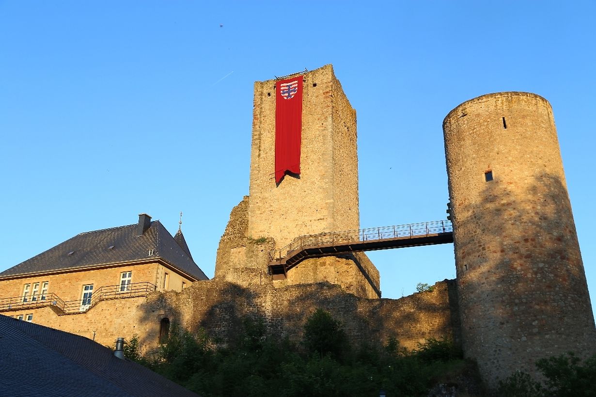 EN: The impressive ruins of the castle with its two towers, connected by a contemporary steel bridge, are located in the midst of the village. During the guided tour, there is a lot to discover, be it up high on the tower, down in the crypt or outside in the medieval vegetable garden. A special highlight: The didactic cultural trail in and around the castle was especially designed for visually impaired people and has been created under UNESCO’s patronage. Reservation required until 16:30 the day before.