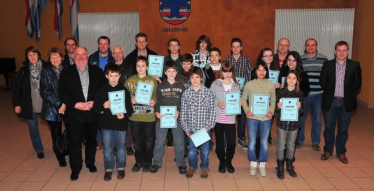 Im Kulturzentrum in Useldingen wurden dieser Tage bereits zum sechsten Mal in Folge, Preise an erfolgreiche Sportler der Gemeinde überreicht. Einleitend ging Bürgermeister Pollo Bodem auf das vergangene Jahr ein, das auf sportlicher Ebene von zahlreichen Erfolgen gekrönt gewesen sei und so sei die Gemeindeverwaltung Useldingen erneut zum Entschluss gekommen, in Zusammenarbeit mit der lokalen Sportkommission um Präsident Marc Hansen, die Sportler zu ehren, die im Laufe des Jahres eine besondere Leistung vollbrachten. Desweiter gab das Gemeindeoberhaupt bekannt, dass die lokale Sportkommission auf den neuen Namen, Sport- und Jugendkommission Gemeinde Useldingen umbenannt worden ist und in Zukunft unter dem Vorsitz von Marielle Goedert aus Schandel weitergeführt wird. Daher ging der Dank des Bürgermeisters an den scheidenden Präsidenten Marc Hansen für sein langjähriges Engagement im Bereich der Sportkommission mit dem Wunsch auf dieselbe gute Zusammenarbeit mit der neuen Vorsitzenden Marielle Goedert.