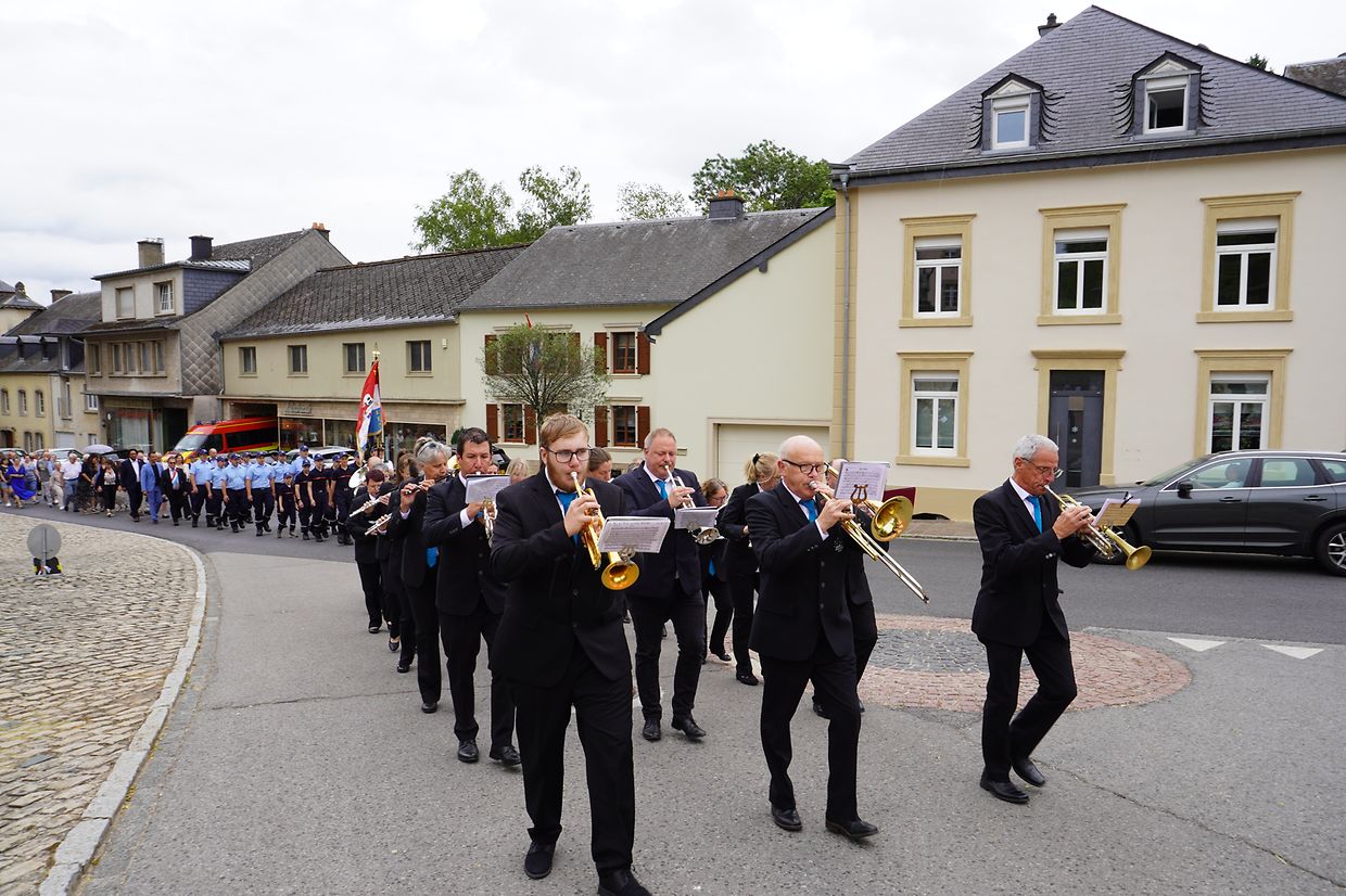 De Cortège fir an d’Kierch, ugefouert vun der Harmonie Useldeng an de Pompjeeën aus der Gemeng goung um 10.15 Auer am Millenhaff fort.