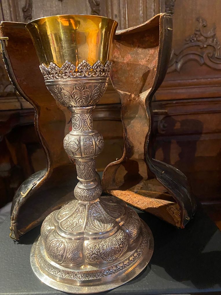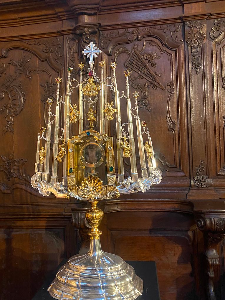 Ein liturgischer Kelch aus der Kapelle Dackscheid, die zur Eifelpfarrei Waxweiler gehört, ist versehen mit dem Wappen von Petrus Ernests Korff-Wiltzius, Minister des Trinitarierklosters im Jahre 1644. Der vom ihm beigefügte Chor der Trinitarierkirche mit seinem herrlichen Trinitarieraltar und den wunderschönen Stallen bietet den idealen Ausstellungsort für diese Goldschätze.