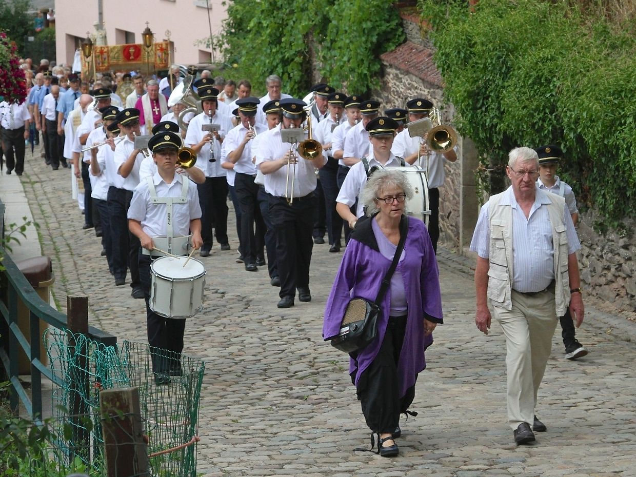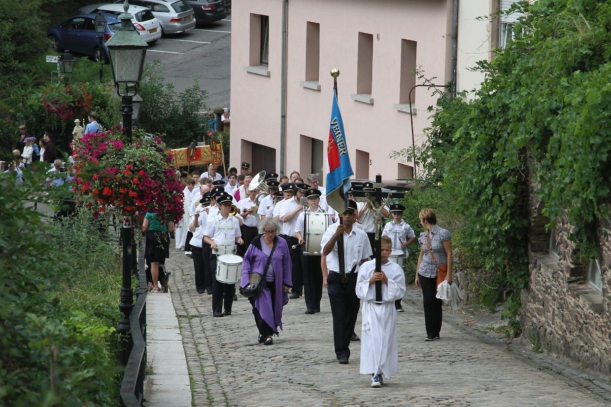Musikalisch umrahmt wurde die Prozession von der „Veiner Stadmusik“ sowie der „Chorale Trinitaire“. Während der Prozession trugen die Mitglieder der Viandener Feuerwehr den sogenannten Himmel.