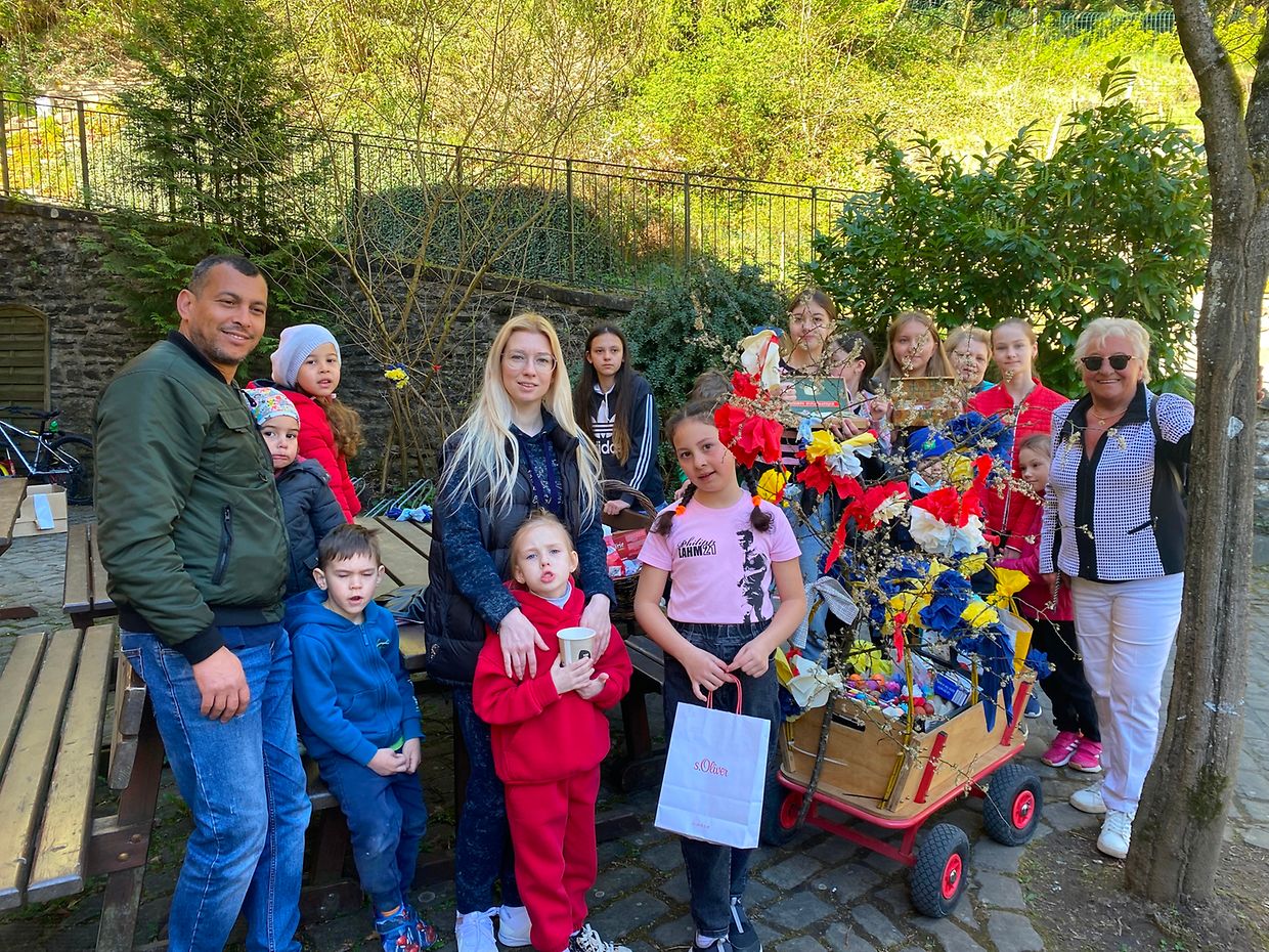 Dass der Einsatz der ukrainischen Kinder von den lokalenEinwohnern begrüβt wurde und ihr Ersatz für die ‘abwesenden’ Glocken belohnt wurde, bewies der vollgefüllte Wagen mit Eiern und Süssigkeiten sowie die gut gefüllte Spendenkasse am Ostersonntag, als die Kinder von Haus zu Haus zogen mit dem Lied: “Dir Leit, gëtt is di Äer erous, di rutt, di wéiss an die blo, Alleluja, Alleluja, di rutt, di wéiss an di blo.”