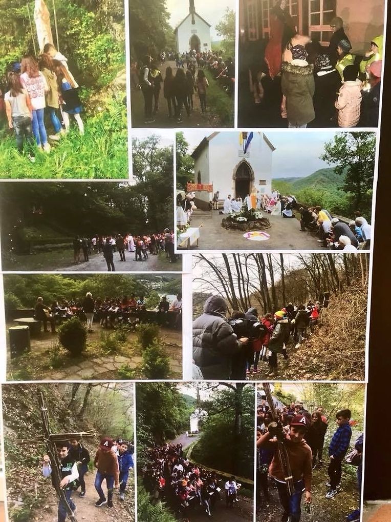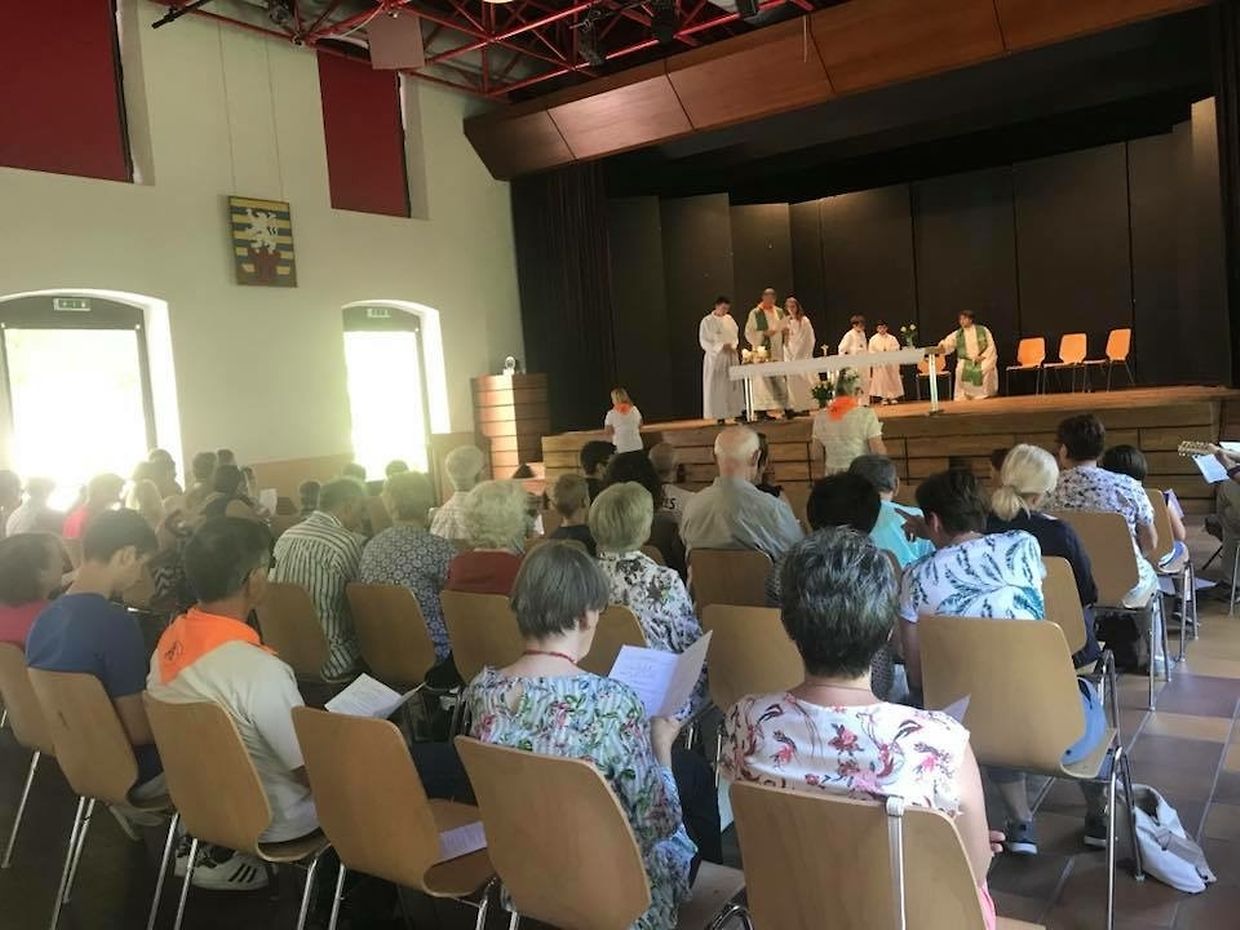 Nach der etwa 10 km langen Wanderung im herrlichen Ourtal, tat sich gegen Mittag eine kunterbunte Wiese im Kulturzentrum Larei in Vianden auf. Ein grosser Teil der 17 Familiengruppen hatte die ca 8 km lange Strecke gemeistert und fand sich zur Messfeier ein.