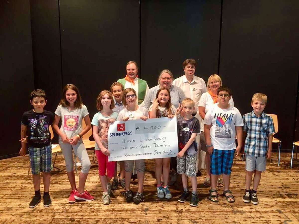 Dass Katechese auch und vor allem bedeutet Verantwortung wahrzunehmen, wurde jedem bewusst, als die Kommunionkinder einen Scheck von 4000 Euros an Missio Luxemburg überreichten mit dem Zweck eine Krankenstation und Medikamente für die Strassenkinder der Cité Damien de Molokaï im Benin zu finanzieren. Mit grossem Dank nahm Mariette Levaye, Generalsekretärin von Mission Luxemburg, den Scheck entgegen.