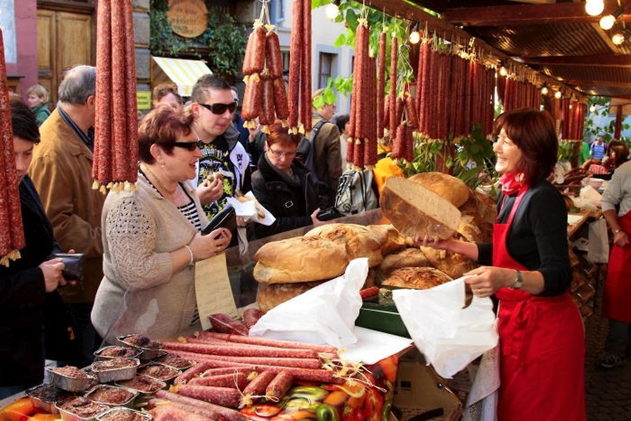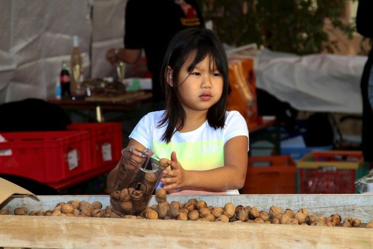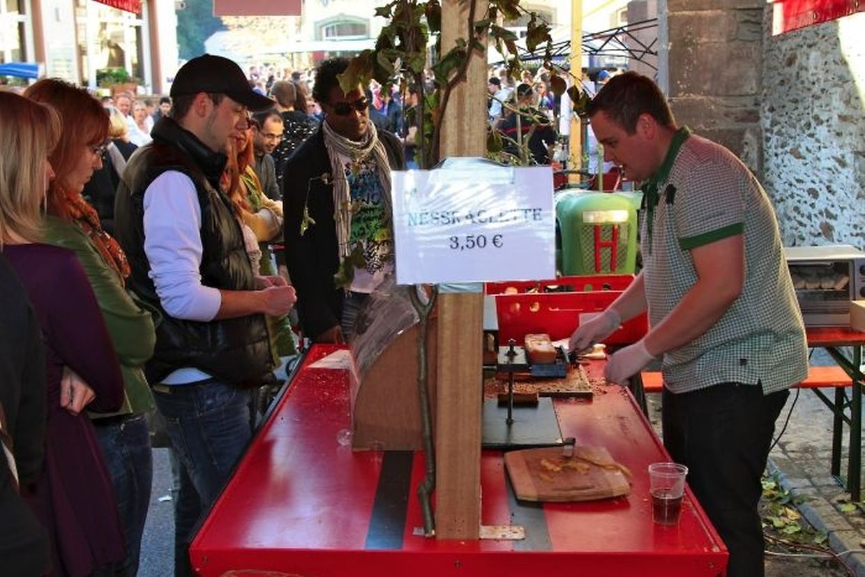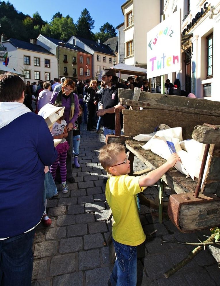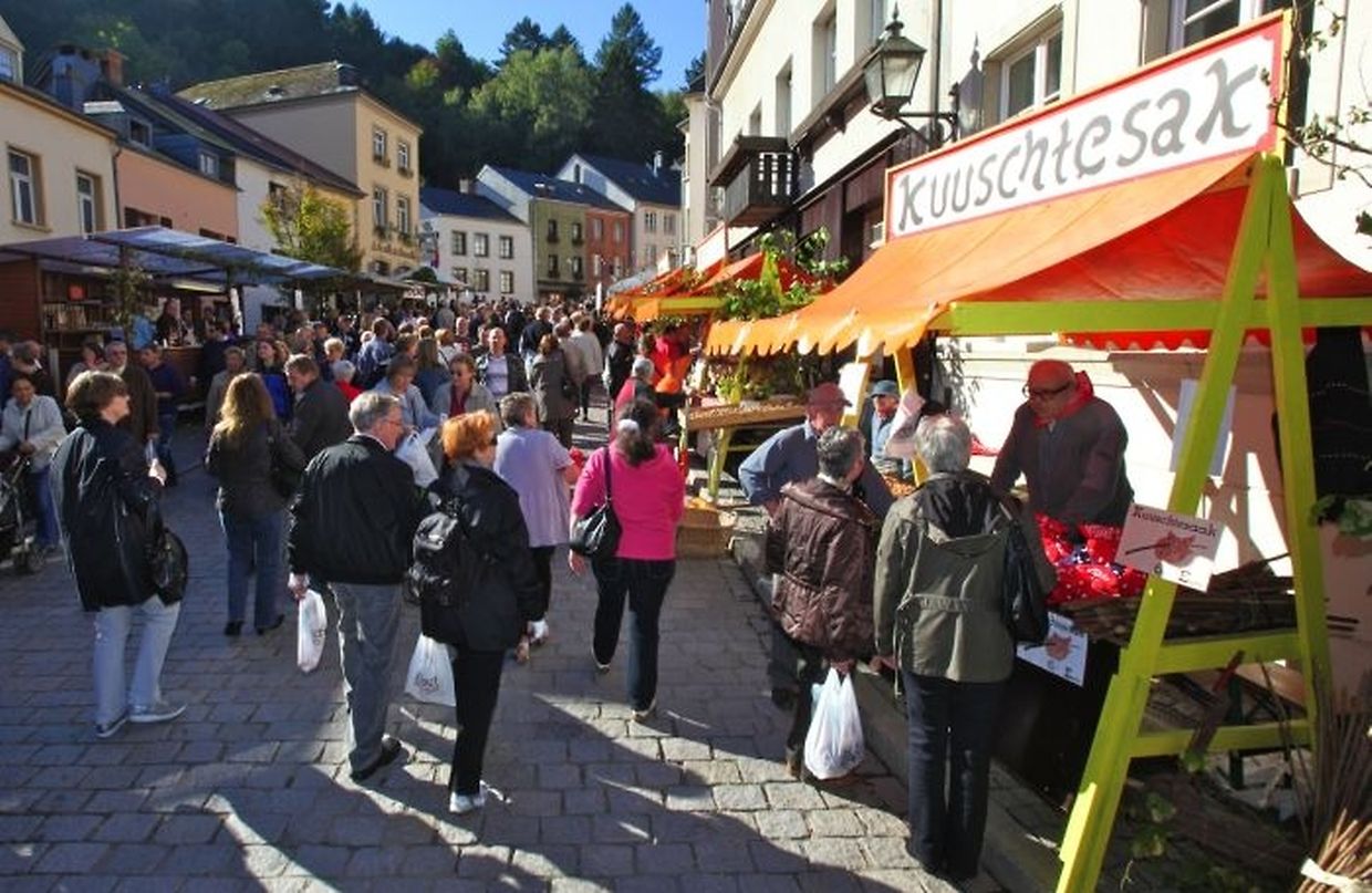 Bereits am Vormittag waren die engen Gassen des Ourstädtchens mit Besuchern gut gefüllt. Vor zwei Wochen schon hatten sich die lokalen Vereine auf den Weg gemacht, um die Nüsse, die sie für den Nussmarkt benötigen, mit Hilfe einer vom lokalen Verkehrsverein eigens angeschafften „Rüttelmaschine“ zu „schidden“ (schütten) und auch, wie seit jeher traditionell mit langen Holzstangen zu „klopen“. Nach dem Schütten werden die Nüsse gewaschen und getrocknet, bevor sie anschließend entweder literweise abgefüllt oder zu allen möglichen kulinarischen Köstlichkeiten verarbeitet werden.