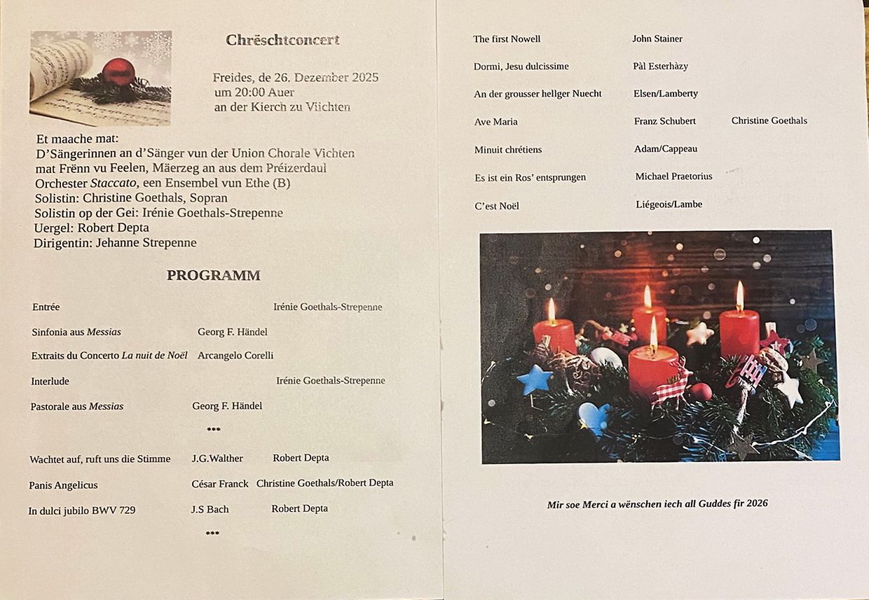Vichten Chrëschtconcert op Stiewesdag an der Viichter Kierch - e vollen Efolleg Charles Reiser 45 Bildergalerie Bitte scrollen Sie nach unten,um weitere Bilder zu sehen. Veröffentlicht am Sonntag, 28. Dezember 2025 um 10:51 Vichten, Luxemburg Fotoen: Charel Reiser Unpassenden Inhalt angeben Weitere Neuigkeiten von Charles Reiser > Dem Hilda Muller- Becker zum 85. Gebuertsdag gratuléiert 30.12.25 Pratz Seniore Frënn Viichten feieren hir Gebuertsdagskanner 23.12.25 Vichten Adventsfënster Aktioun 2025 am Préizerdaul- En Erfolleg 22.12.25 Bettborn Chrëschtconcert vun der Musikschoul Kanton Réiden zu Ueschdrëf 22.12.25 Arsdorf Schéine Chrëschtconcert vun der Harmonie Useldeng an der Kierch 22.12.25 Useldingen