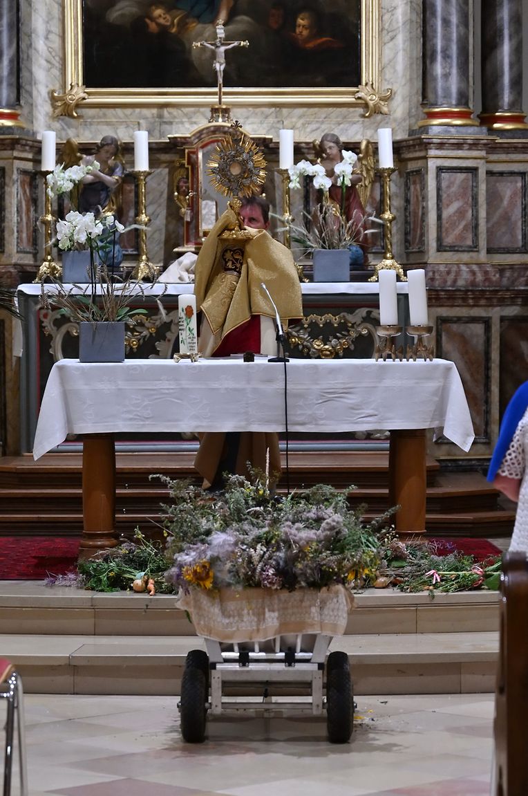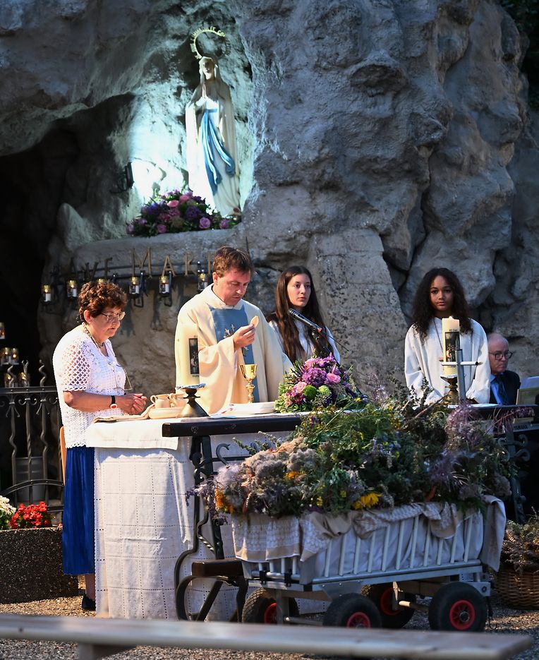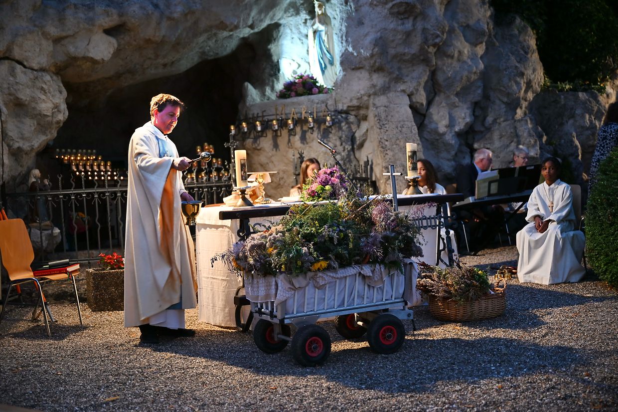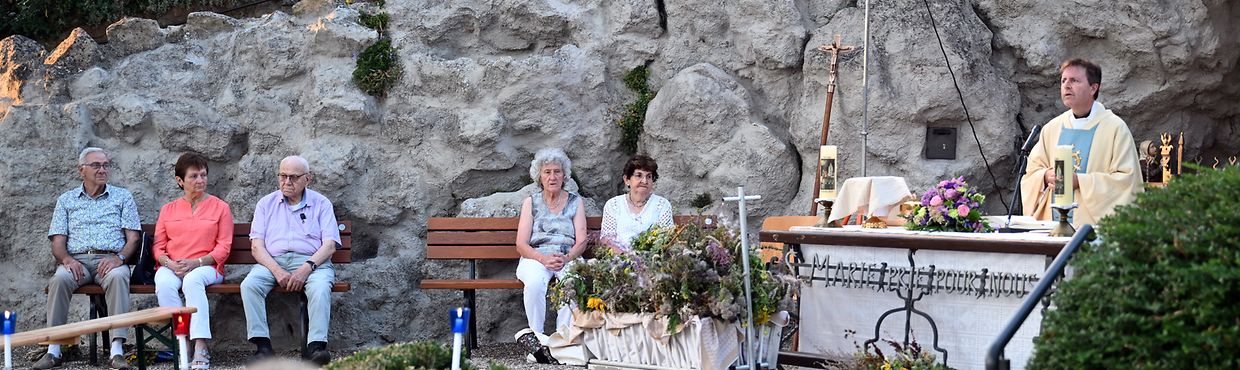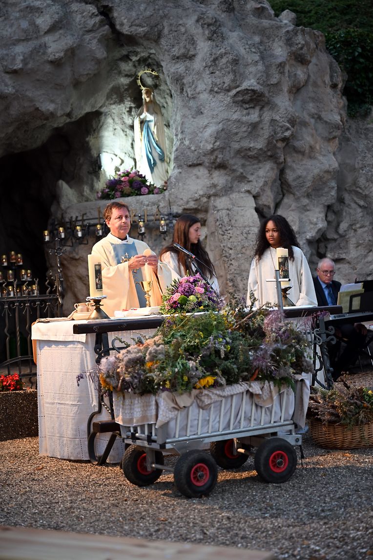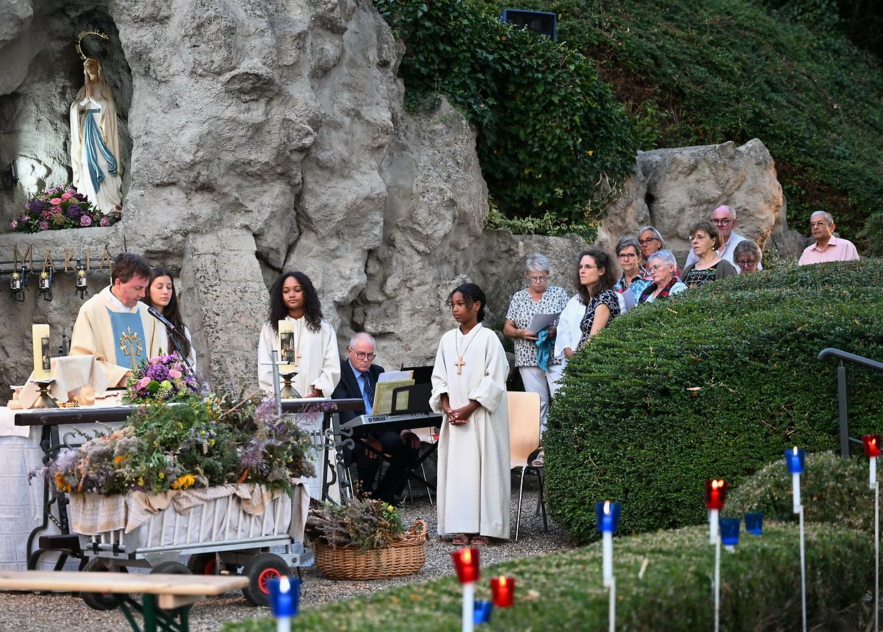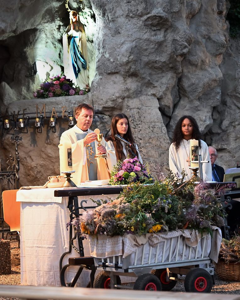 Viichten: De feierlichen Gottesdëngst, zelebréiert vum Abbé Jacques Bagnoud gouf verschéinert duerch de Gesangveräin vu Viichten ënnert der Direktioun vum Jehanne Goethals – Strepenne. No der Mass wou och vill Pilger dorunner Deel geholl hun, ass den sakramentale Seegen zum Ofschloss vum Fest vu Maria Himmelfahrt an der Kierch erdeelt gin. (CR). (Fotoen: Charles Reiser)