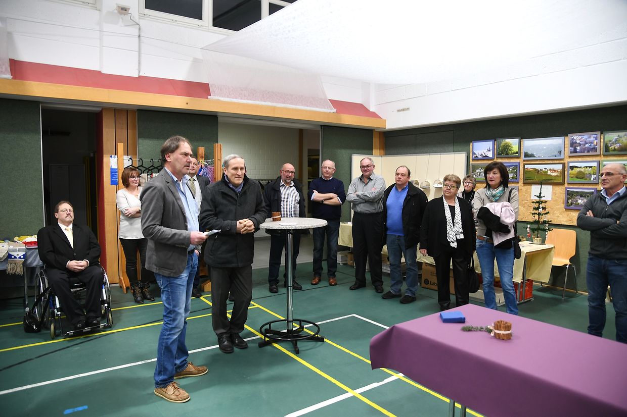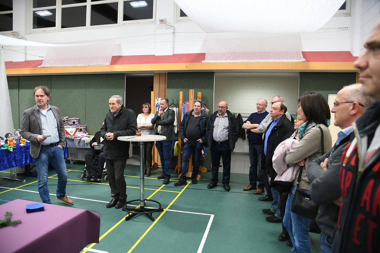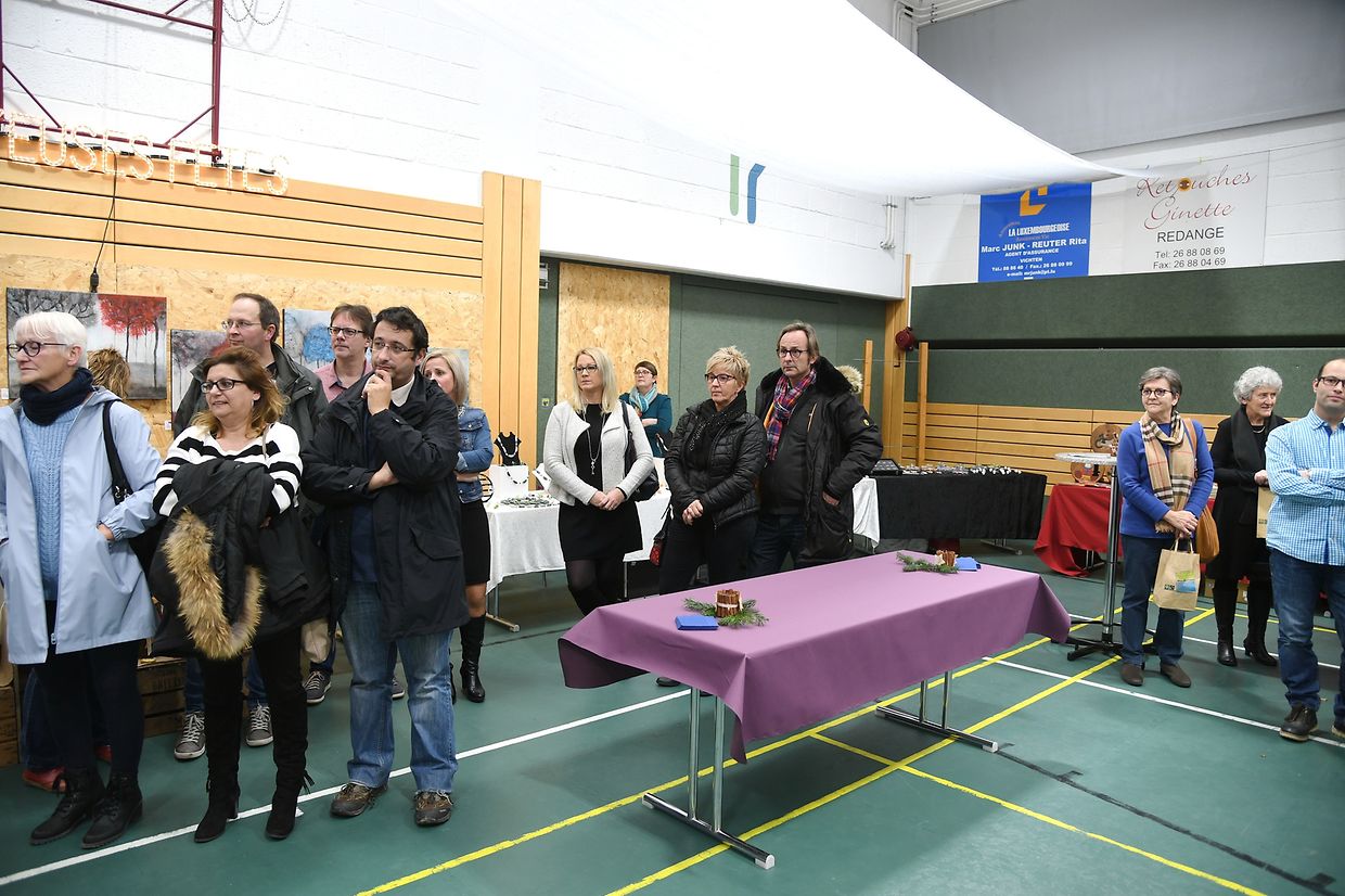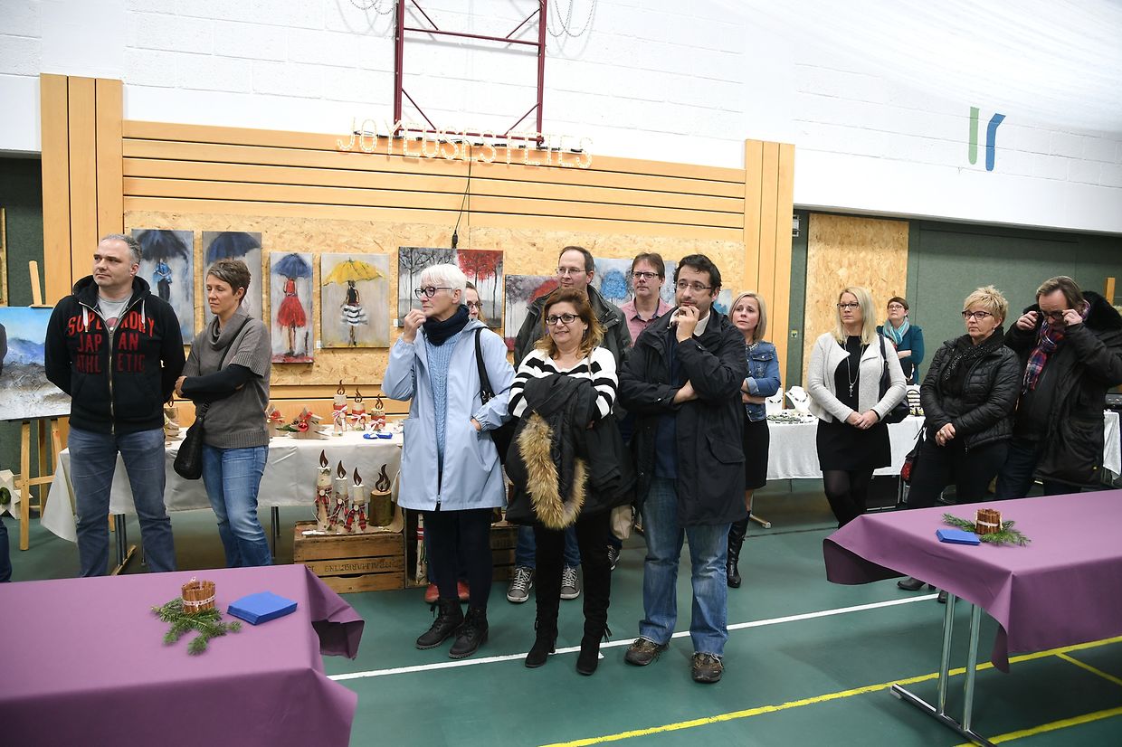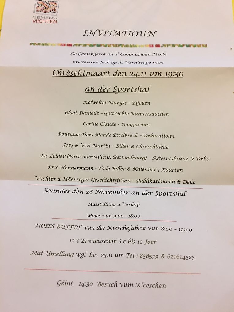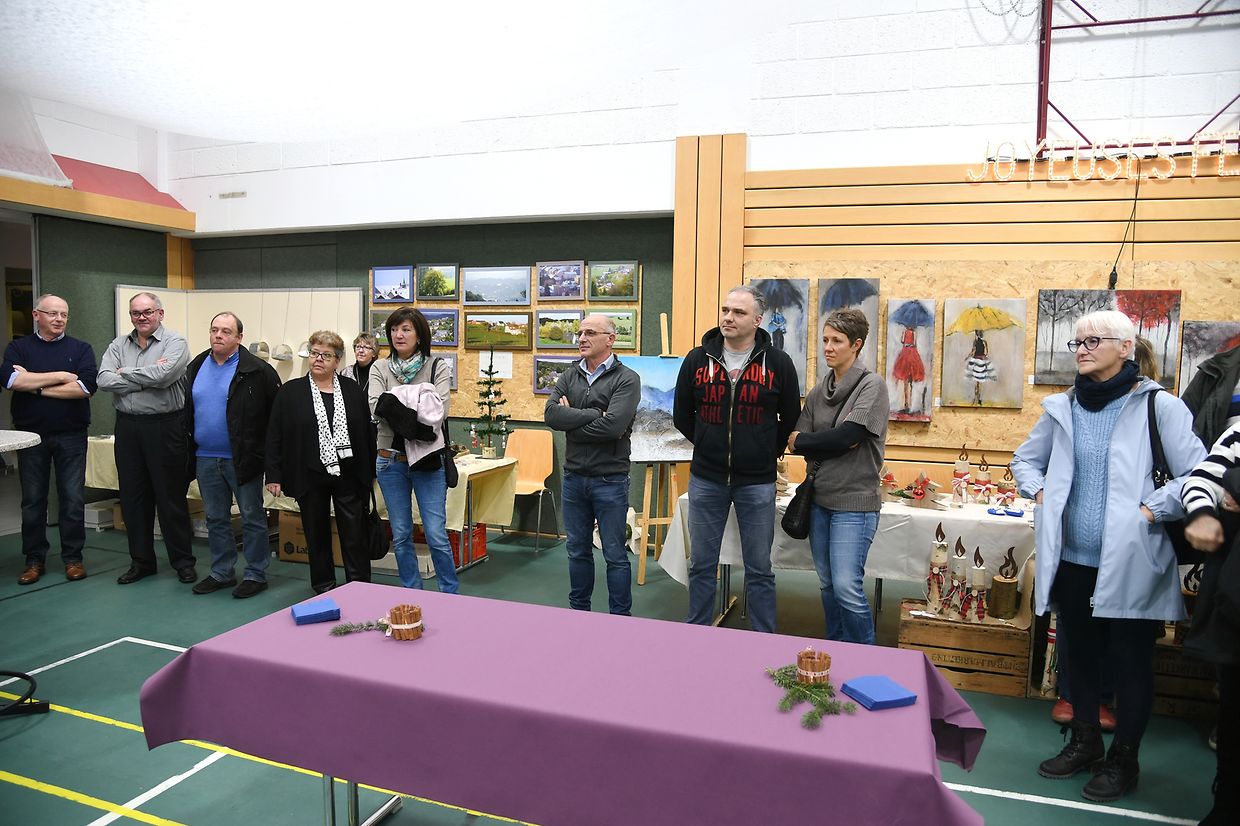 Op hir Vernissagefeier hat de Gemengerot an d'Commission mixte vu Viichten an d'Sportshal invitéiert. No de Gléckwënsch vum Präsident Romain Jacoby a vum Buergermeschter Jean Colombera, déi den Kënschtler fir hir wonnerbar Exponater hire Respekt ausgesprach hun, konnten folgend Aussteller hier Wierker dem Publkum virstellen. Maryse Kolwelter- Bijouen, Danielle Glodt- gestréckte Kannersaachen, Corine Claude -Amigurumi, Boutique Tiers Monde Ettelbrëck- Dekoratioun, Joly & Vivi Martin- Biller a Chrëschtdeko, Lis Leider- Adventskränz & Dekoartikel, Eric Heimermann- Toile Biller, Kalenner a Kaarten, Viichter a Mäerzeger Geschichtsfrënn- Publikatiounen & Deko. D'Ausstellung mat Verkaf an der Viichter Sportshal mat fräiem Entrée ass dese Sonndeg vun 9 bis 18 Auer ze besichtigen. (TEXT a FOTOEN : CHAREL REISER)