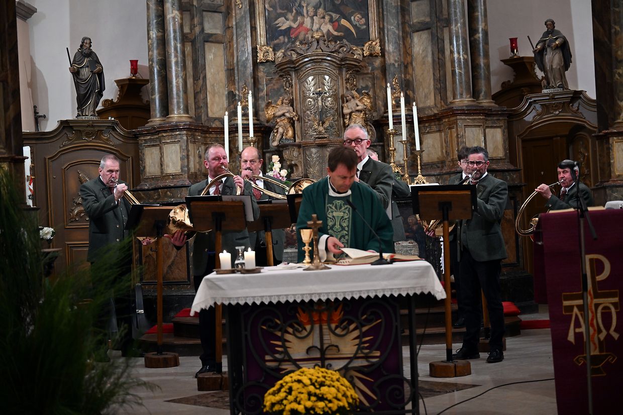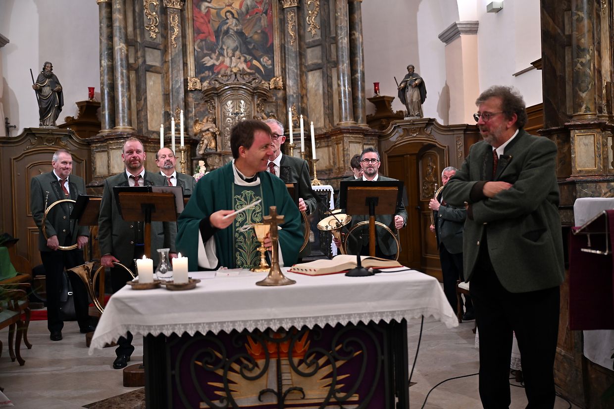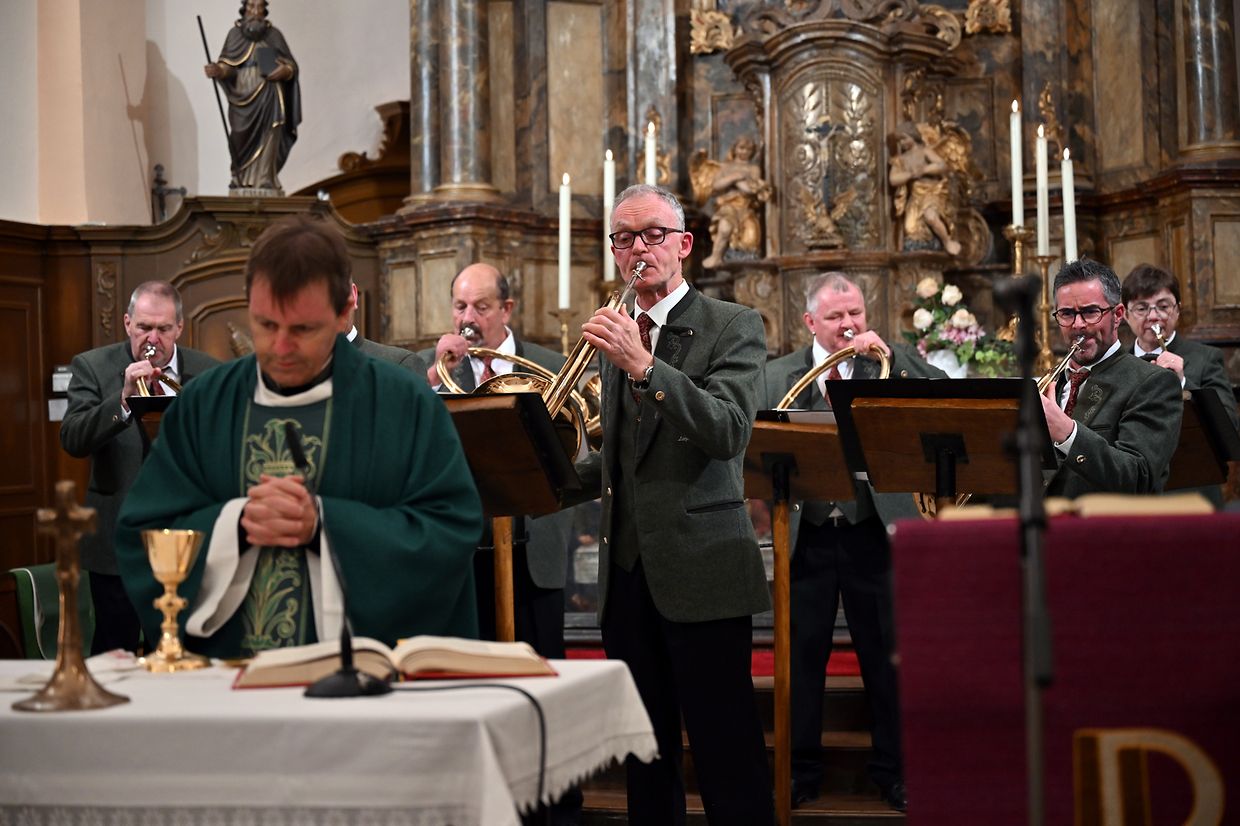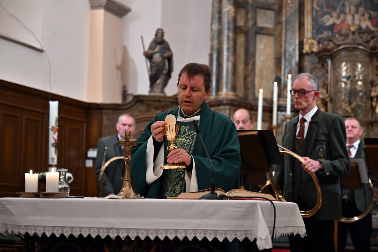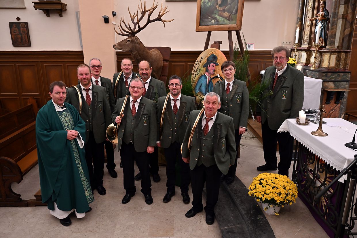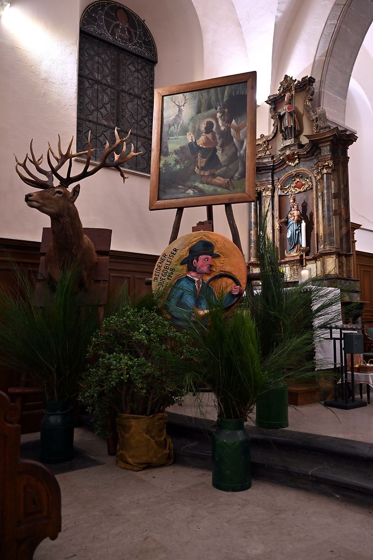 Wal: Zënter 2001 ass et di schéin Traditioun vun de Réidener Juegdbléiser, vir d’Haupeschmass all Joer an engem aaneren Eck vum Réidener Kanton ofzehaalen. An der mat schéiner Juegddekoratioun gerëschter Kierch zu Wal gouf de Gottesdëngst dest Joer dann vum Paschtouer Jacques Bagnoud zelebréiert. Passender Weis hun di Réidener Juegdbléiser ënnert der Leedung vum Marc Pletgen fir d’Verschéinerung vun der Hubertusmass gesuergt. A senger Predigt ass den Jacques Bagnoud op d’Missioun an d‘Passioun vum Jeeër an der Natur ënnert hirem Schutzpatroun dem hl. Hubertus agaangen. Séin spezielle Merci huet hien de Réidener Juegdbléiser ausgesprach fir di schéin Traditioun, d’Haupeschmass all Joers op en neis mat hiren klangvollen Instrumenter ze verschéineren. Och de President Guy Schank huet zum Schluss vun der Mass all Bedeeligten säin Merci ausgedrëckt, déi zur Gestaltung vun der 34. Haupeschmass zu Wal beigedroen hun. Mat engem vun de Juegdbléiser offréirertem Concert mat Juegdmusek beim Fâkelschäin an engem Glas Glühwäin huet dess schéi Feier zu Wal hiren würdigen Ofschloss fond. (CR) (Foto: Charles Reiser)