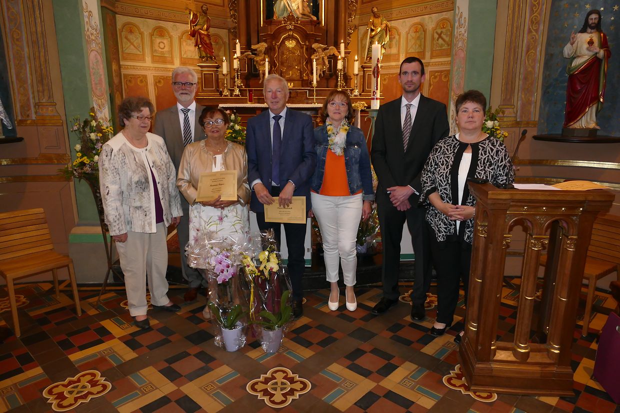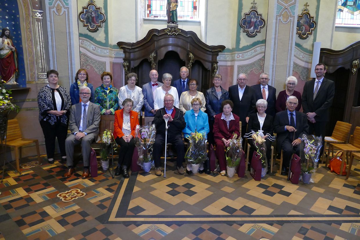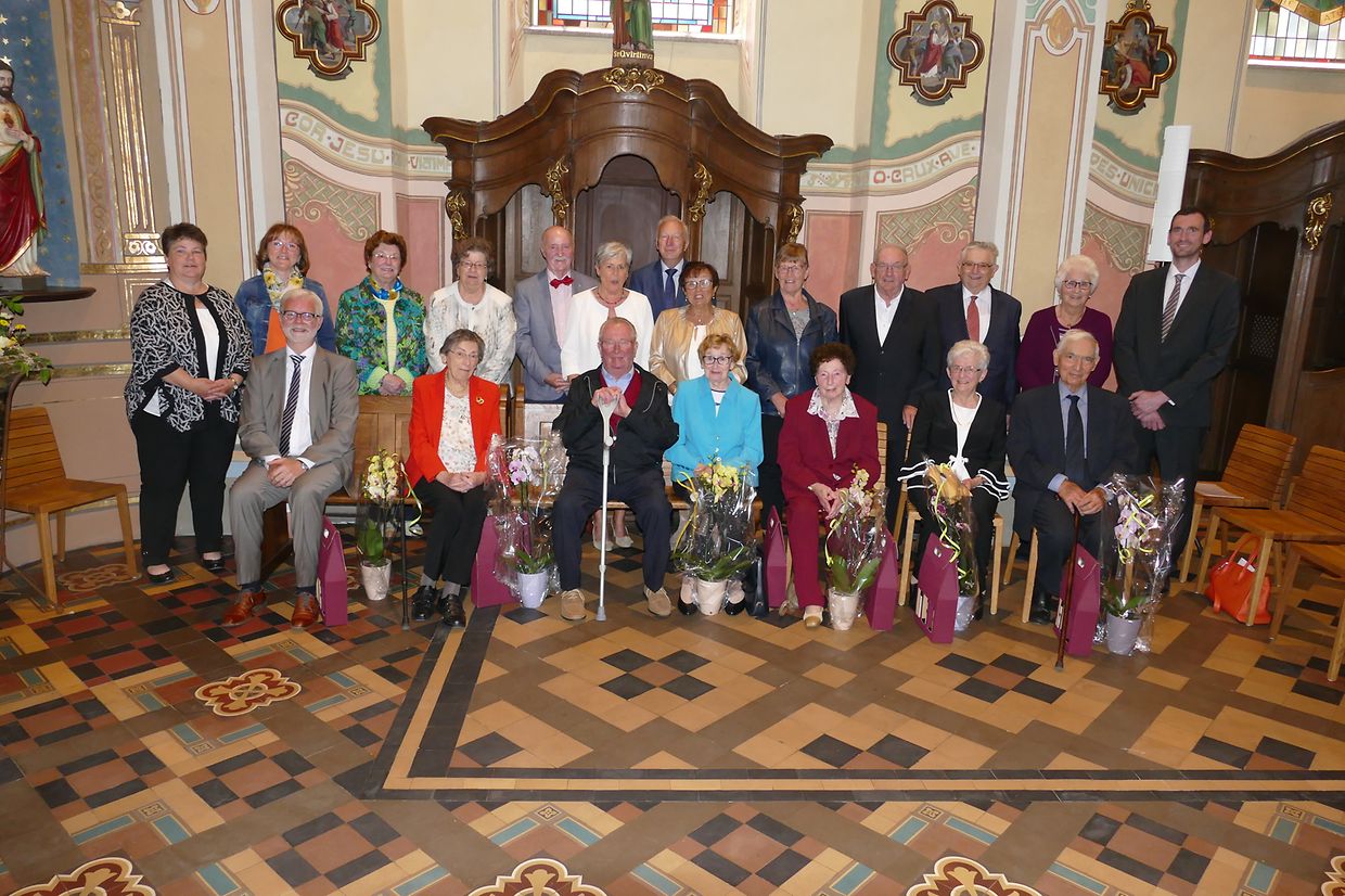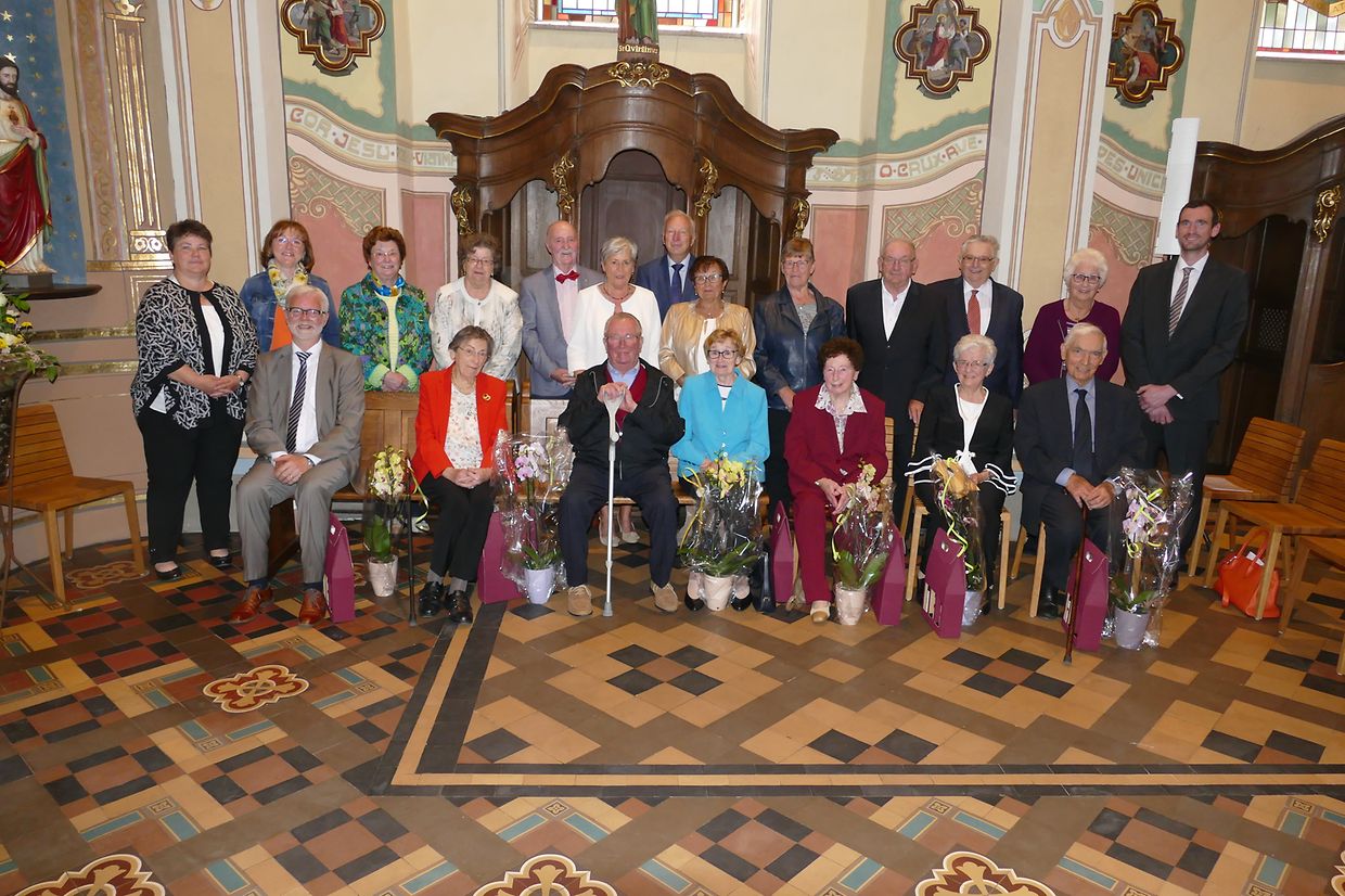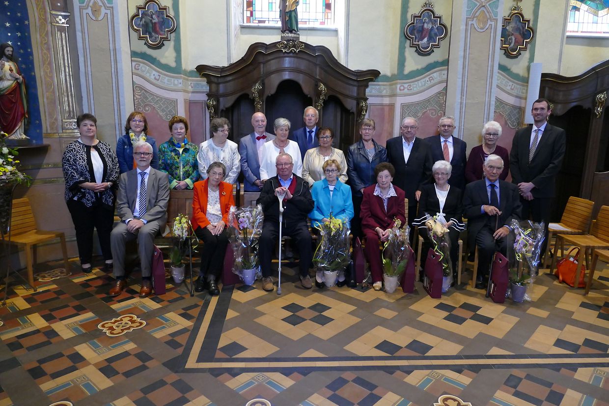 Anschließend beglückwünschten die Bürgermeisterin und der Präsident die Mitbürger, die im Laufe des Jahres ihren 75., 80., 85., 90. und 95. Geburtstag feierten. Der Schöffenrat sowie der Vorstand von « Jonk an Al » überreichten den anwesenden Jubilaren passende Geschenke : Bos-De Dood Trus (75 Jahre), Diederich-Meyers Marianne, Diederich Pierre, Fantin-Goergen Marguerite, Karpen Marianne, Mehlen Anje, Feltgen-Meyers Lucie (80 Jahre), Mehlen Pierre, Schaaf Raymond, Steinmetz Raymond, Franck-Tossing Barbe (85 Jahre), Hary-Wilhelm Juliette, Rippinger-Muller Irène, Seiwert Charel, Scholtes-Greischer Barbe, Alf Raymond (90 Jahre), Kunnert Mimi, Lies Edouard, Richard-Gloesener Virginie, Weydert-Ries Marie Justine (95 Jahre).