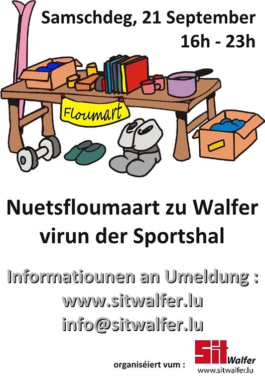 Samedi 21 septembre, à partir de 16h, le SIT organise un vide grenier et brocante, devant le hall sportif a Walferdange.