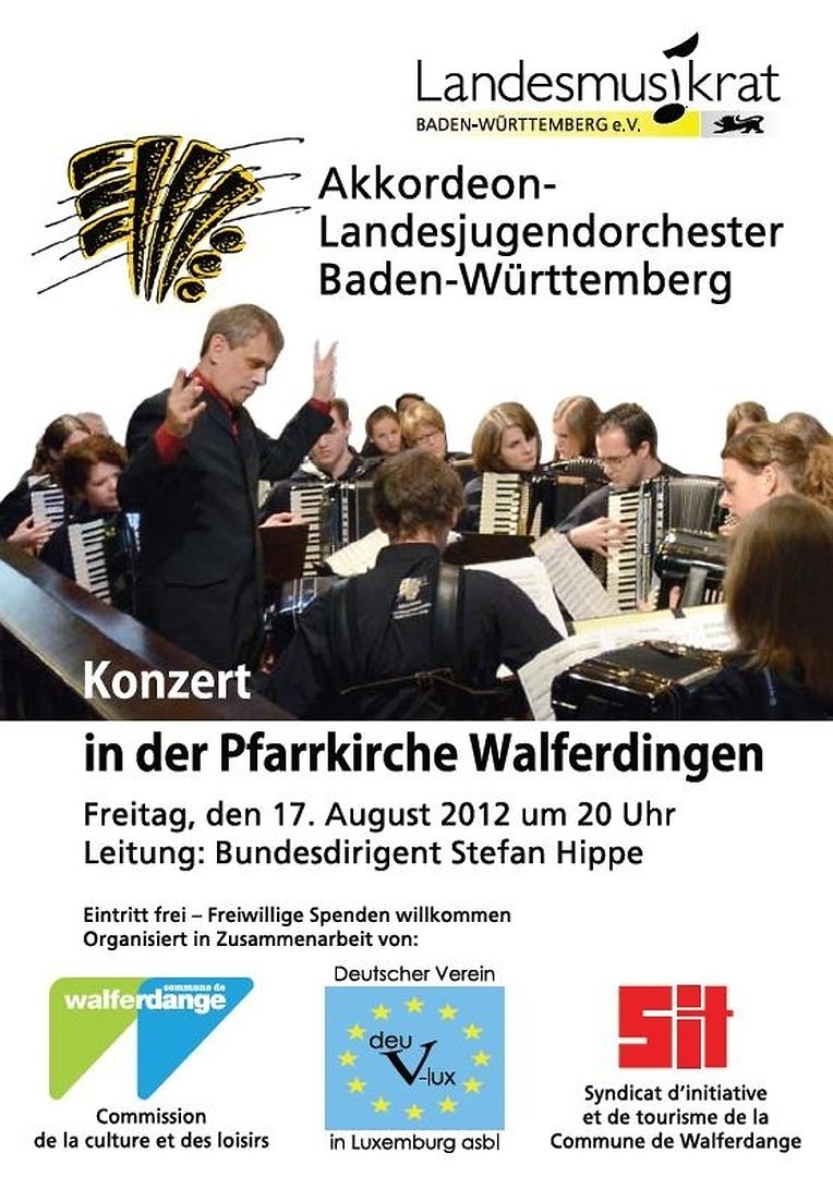 Walferdingen Concert d'accordéon 17 août 2012 20h Sit Walfer 2 Bildergalerie Bitte scrollen Sie nach unten,um weitere Bilder zu sehen. Veröffentlicht am Freitag, 20. Juli 2012 um 01:19 Musique classique jouée par l'orchestre des jeunes accordéonistes du Land de Bade-Wurtemberg 17 août 2012, 20 h Eglise de la Trinité, Walferdange Entrée libre Organisé par le SIT en coopération avec la Commission de la culture et des loisirs et le Deutscher Verein à Luxembourg aljo.pdf Unpassenden Inhalt angeben Weitere Neuigkeiten von Sit Walfer > Soirée Musicale 2020 - ANNULE 13.03.20 Walferdingen Assemblée générale ordinaire de l'année 2014 13.03.14 Walferdingen Soirée Musicale 2014 13.03.14 Walferdingen Video: Le qanat des «Raschpëtzer» 27.03.13 Walferdingen Soirée Musicale (Vendredi, 15 mars 2013, 20h) 06.02.13 Walferdingen