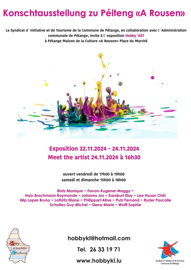 Vum 22. bis den 24. November 2024 war zu Péiteng an der Maison de la Culture a Rousen eng Biller a Skulpturenausstellung wou 14 Membere vun Hobbykënschtler Lëtzebuerg asbl ausgestallt hunn.