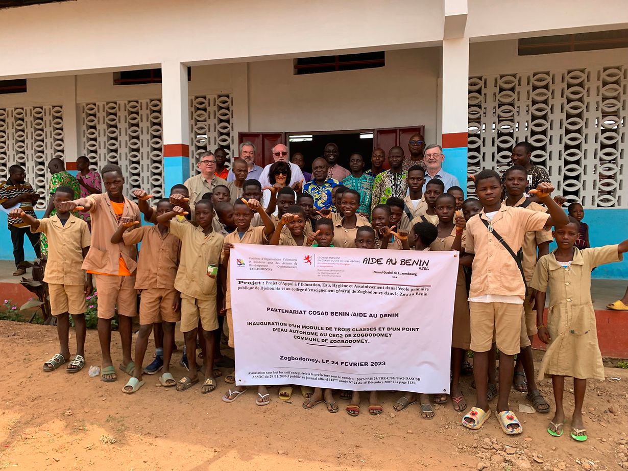 A la fin du mois de février dernier, une délégation de 5 personnes du Conseil d'Administration de l'association "Aide au Bénin" a eu le plaisir d'inaugurer une école avec 3 salles de classes, complétement équipées et un forage de puits avec château d'eau et latrines à Djohounta, un village qui se situe dans une des régions les plus défavorisées du Bénin. L'investissement a été supporté pr l'ONG Aide au Bénin a.s.b.l. et cofinancé par le Ministère des Affaires étrangères, Direction Coopération.