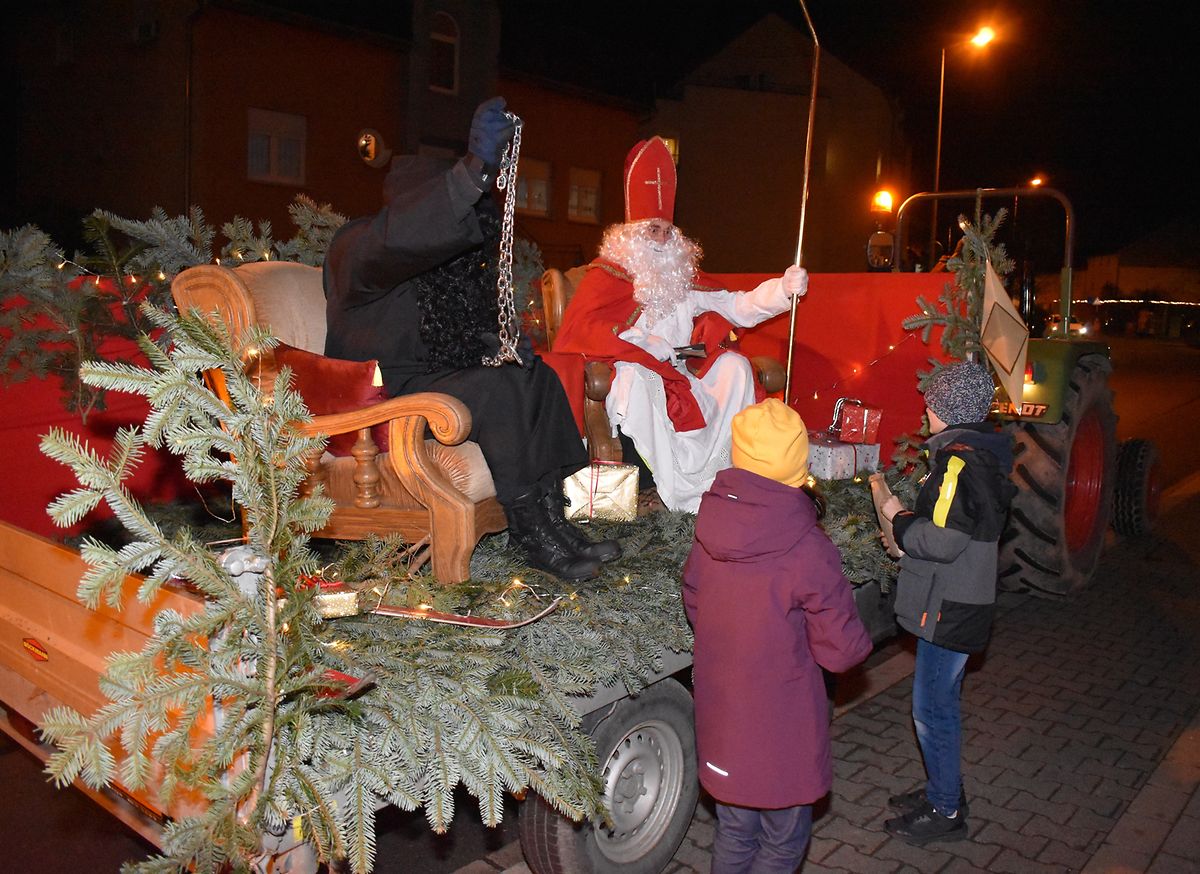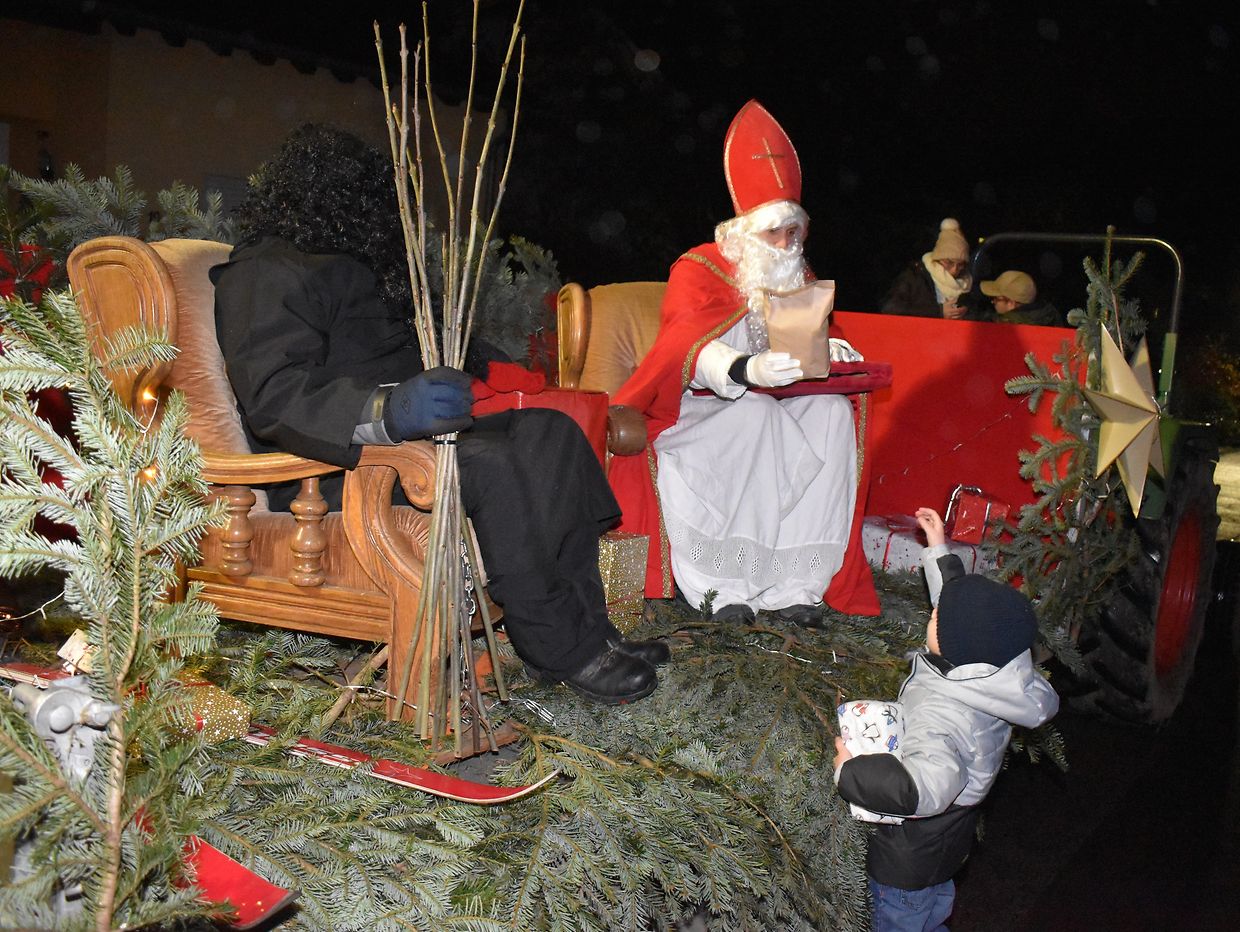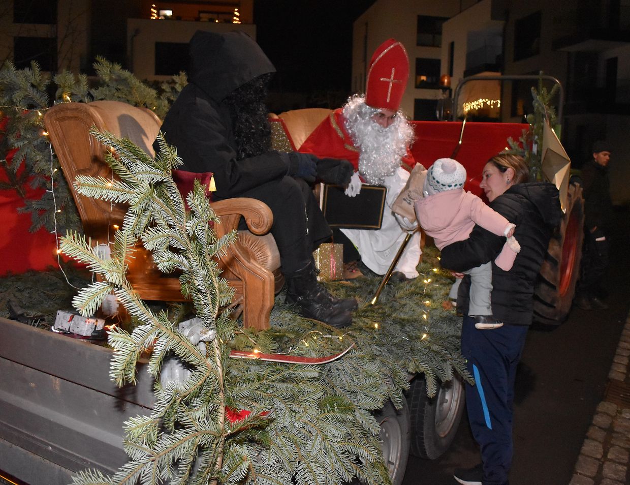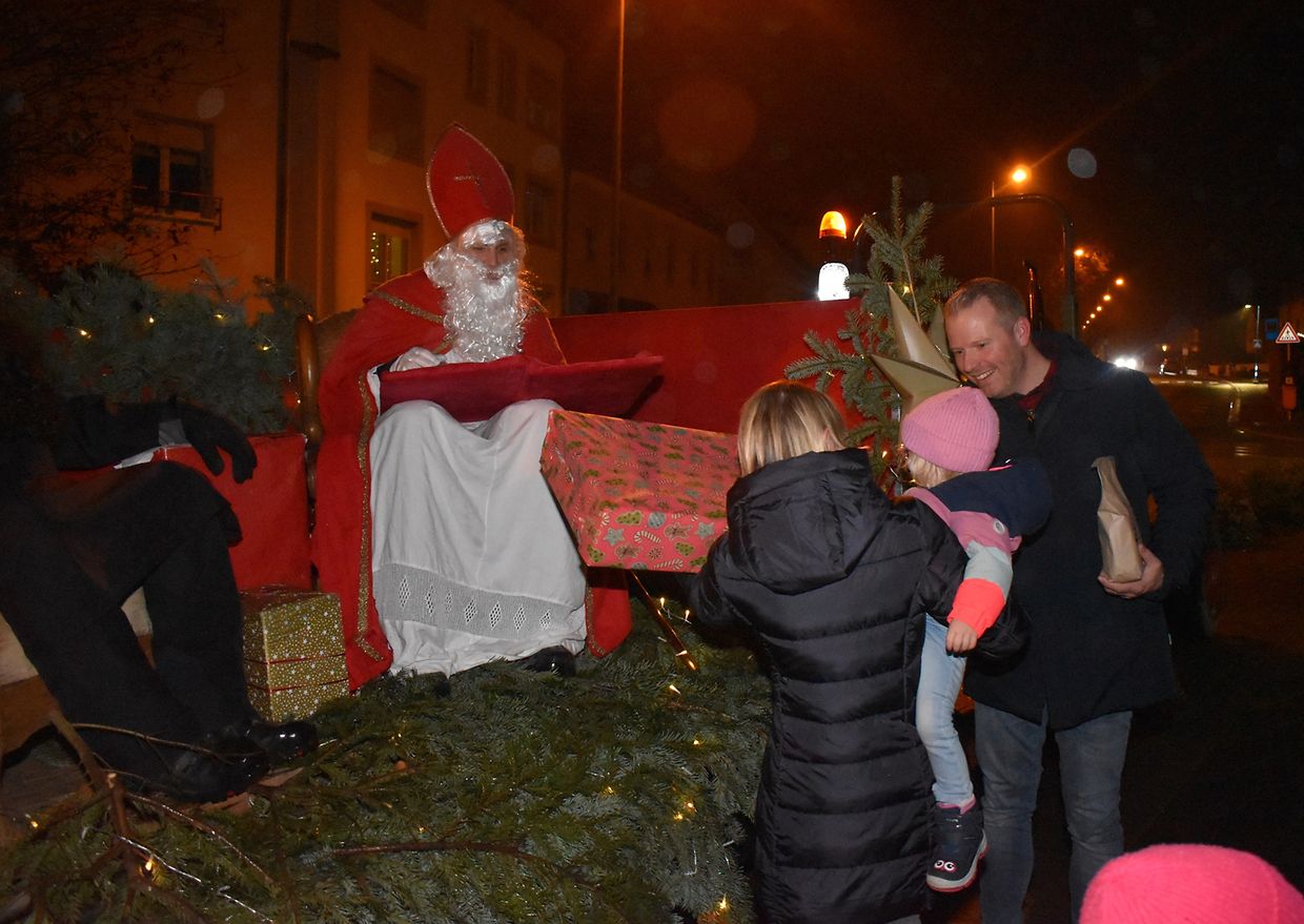 Durch die steigende Zahl von Kindern in Warken, wo zurzeit 1.570 Einwohner leben, ist es dem Kleeschen und dem Houseker der „Waarker Jeekelen“ nicht mehr möglich jedes Kind einzeln zuhause zu besuchen. Aus der Not geboren hatte man im Corona-Jahr 2020 ein Gespann aufgebaut, auf dem Sankt Nikolaus und Knecht Ruprecht in bequemen Sesseln Platz nahmen, um so bei den Kindern zuhause vorzufahren, wo diese dann ihre Geschenktüte abholen konnten. Seither hält man an diesem Prozedere fest und die Kinder genossen auch diesmal wieder mit leuchtenden Augen die Ankunft der beiden ehrwürdigen Herren. Gleich an zwei Abenden waren diese in Warken unterwegs, galt es diesmal doch 48 Kinder zu beschenken. War es am ersten Tag noch trocken geblieben, so wurde von ihnen am darauffolgenden Tag einiges abverlangt. Ein Nieselregen bei unangenehmen Außentemperaturen stellte alle - auch die Begleiter - auf die Probe. Der Freude der Kinder tat dies allerdings keinen Abbruch, und immer wieder wurde „Léiwe Kleeschen, gudde Kleeschen“ angestimmt. Und auch die Erwachsenen hatten ihren Spaβ und halfen gelegentlich ihren Sprösslingen gesanglich aus.