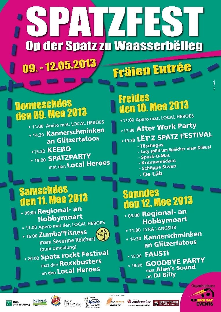 An Christiehimmelfahrt (9. Mai) beginnt das Spatzfest mit Apéromusik von den Local Heroes. Ab 14:00 Uhr können die Kinder sich schminken lassen. Gegen 15:30 wird die Band Keebo Coversongs und Eigenkompositionen spielen. Es handelt sich hierbei um eine Band mit erfahrenen Musikern, welche früher alle bei den bekanntesten Coverbands Luxemburgs gespielt haben.
