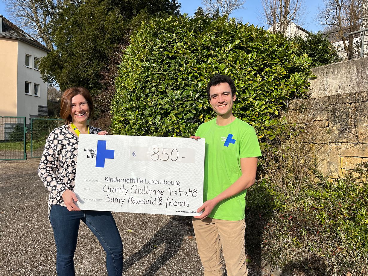 Alle vier Stunden vier Meilen (ca. 6,5 km) laufen und das 48 Stunden lang, das ist das Konzept der "4x4x48"- Challenge, die der amerikanische Sportler David Goggins ursprünglich ins Leben gerufen hat. Viele Freunde, Bekannte und Sponsoren unterstützten das Vorhaben der passionierten Luxemburger, so dass insgesamt ein Betrag von 850 Euro zusammenkam. Dieser Tage fand die Schecküberreichung vor dem Büro der Kindernothilfe Luxembourg in Luxembourg-Eich statt.