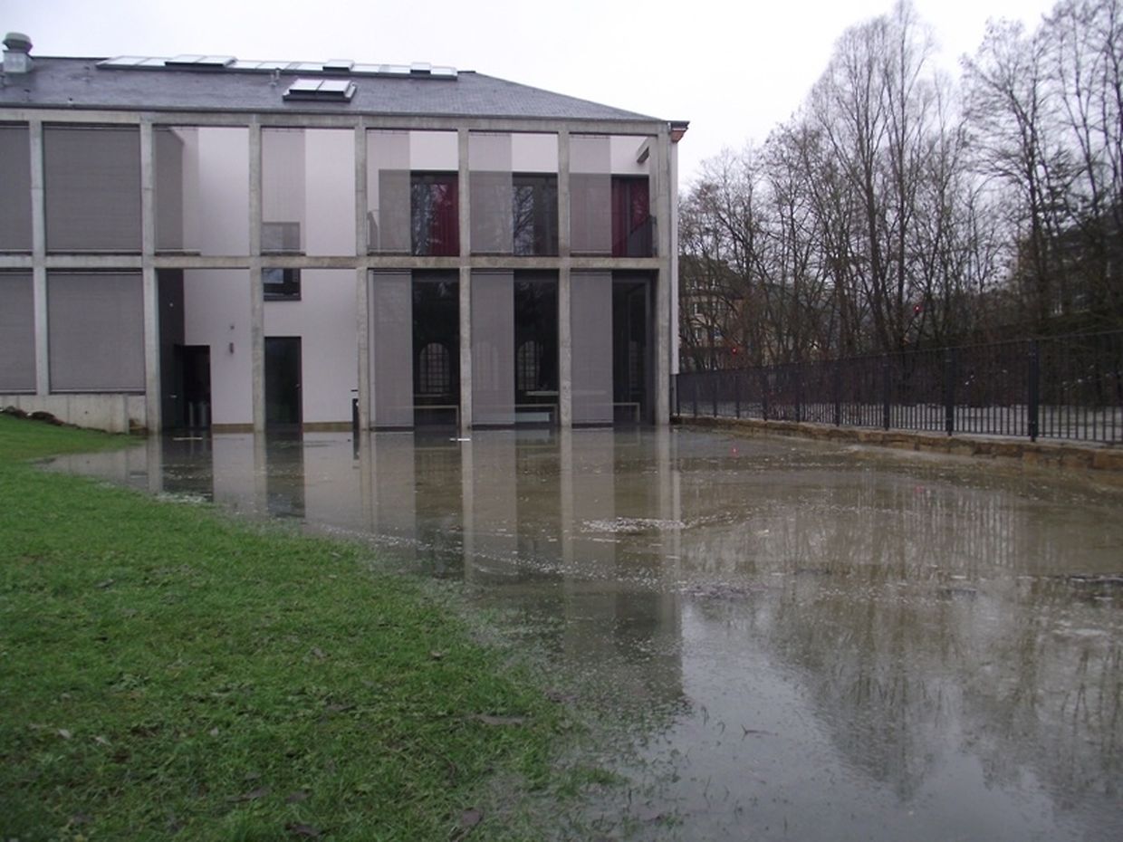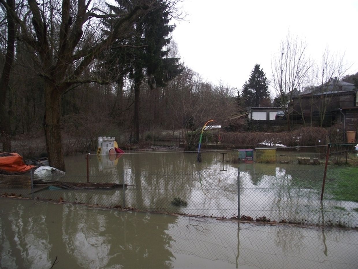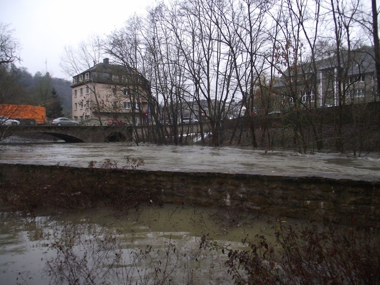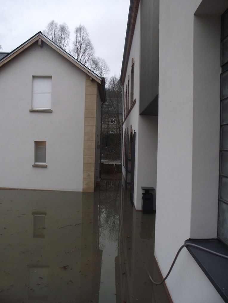 Wei een op de Fotoen vun erkenne kann, ass d'Waasser nett virun der Dier stoe bliwwen. De Scoutszenter stung de Moien ënner Waasser. Schued wir dobai awer su gut wi keen geschitt mengt den Tom Biwer, deen am Zenter schafft.
