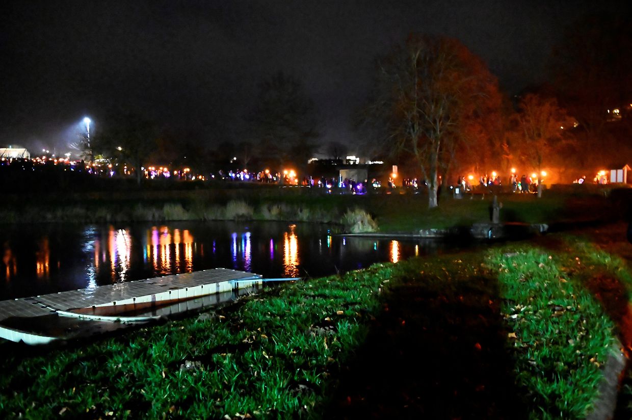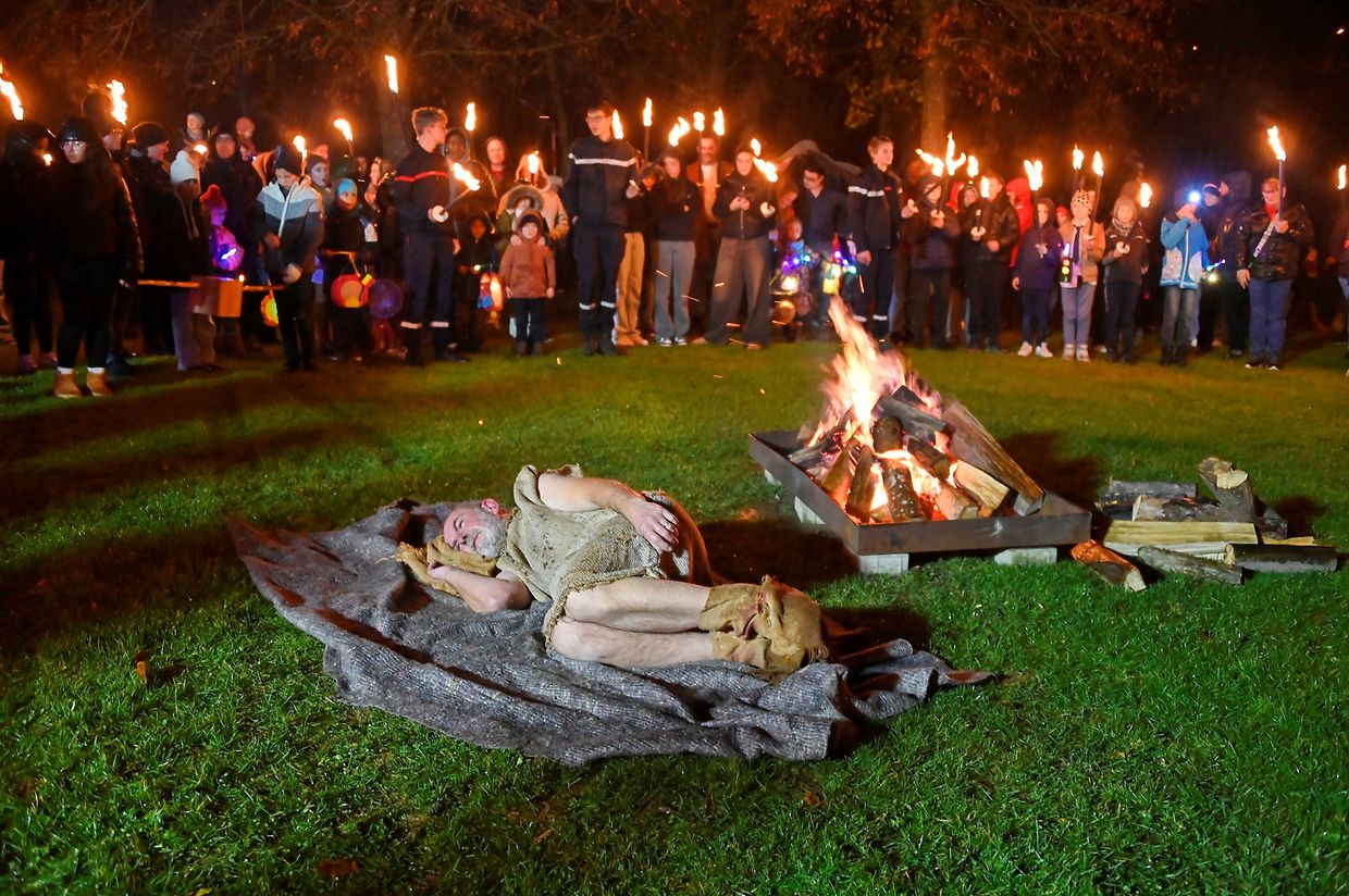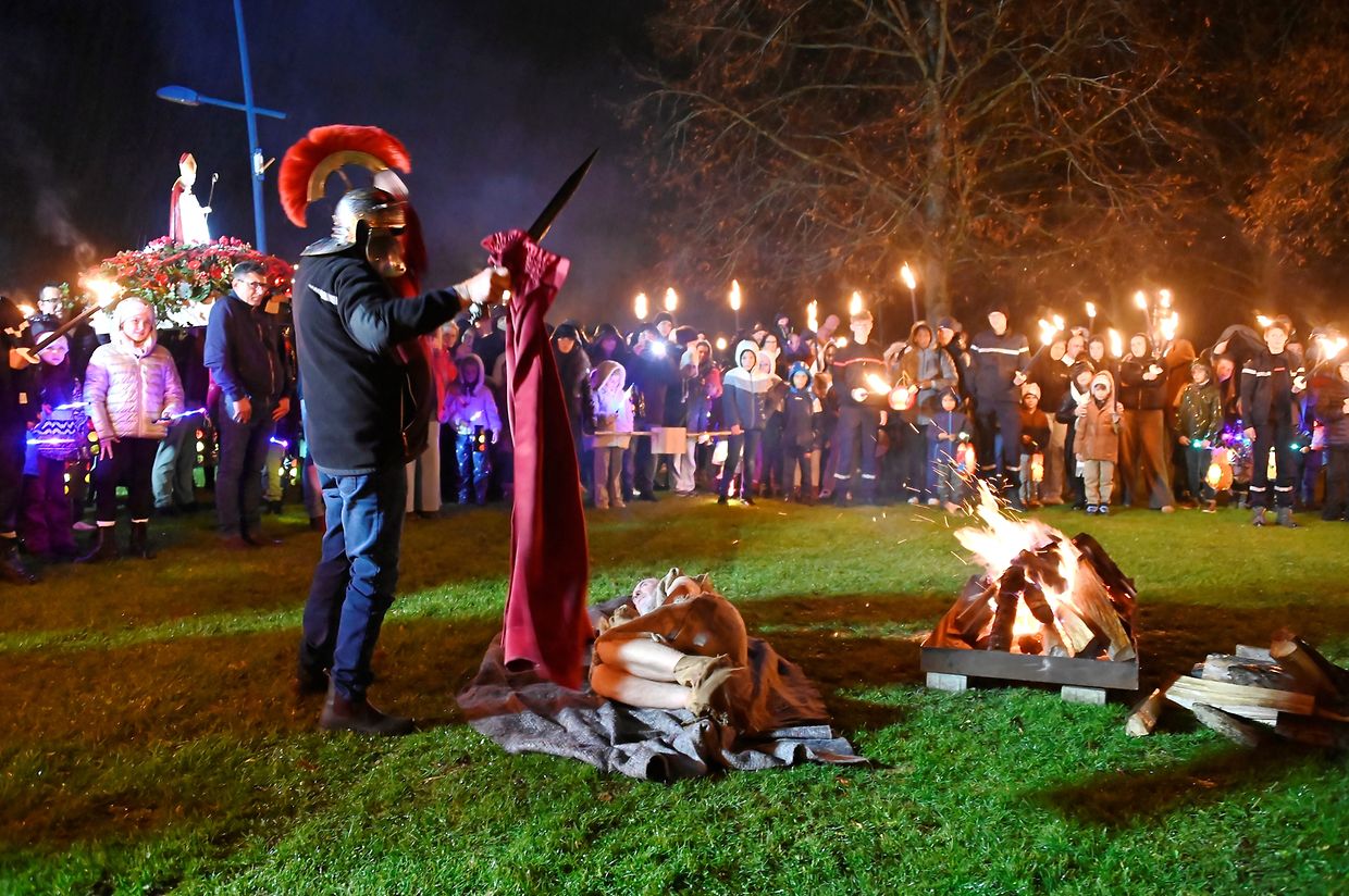 Nach der Martinsfeier im Zelt beim See in Weiswampach stellte sich der Laternenumzug auf, angeführt von St. Martin auf dem Pferd, den Jugendpompjëen, den Kindern mit den Gebeten aus der Familienkirche Wilwerdingen, des Musikvereines von Weiswampach. Neu in diesem Jahr war die Martinsstatue, die von vier portugiesischen Männern getragen wurde wie es in Portugal üblich ist. Der Laternenumzug begab sich beim Martinsfeuer, wo St. Martin seinen Mantel mit dem Bettler teilt.