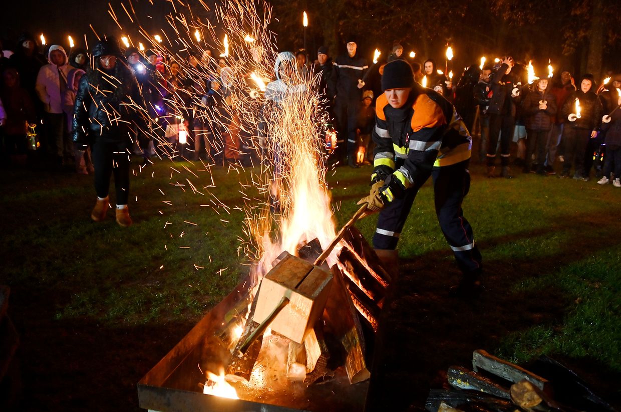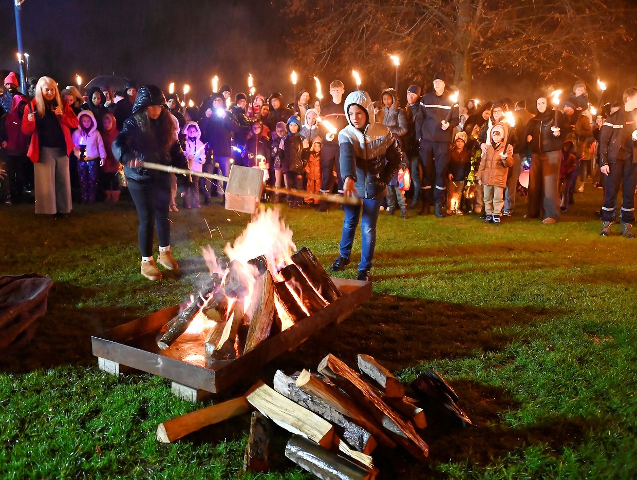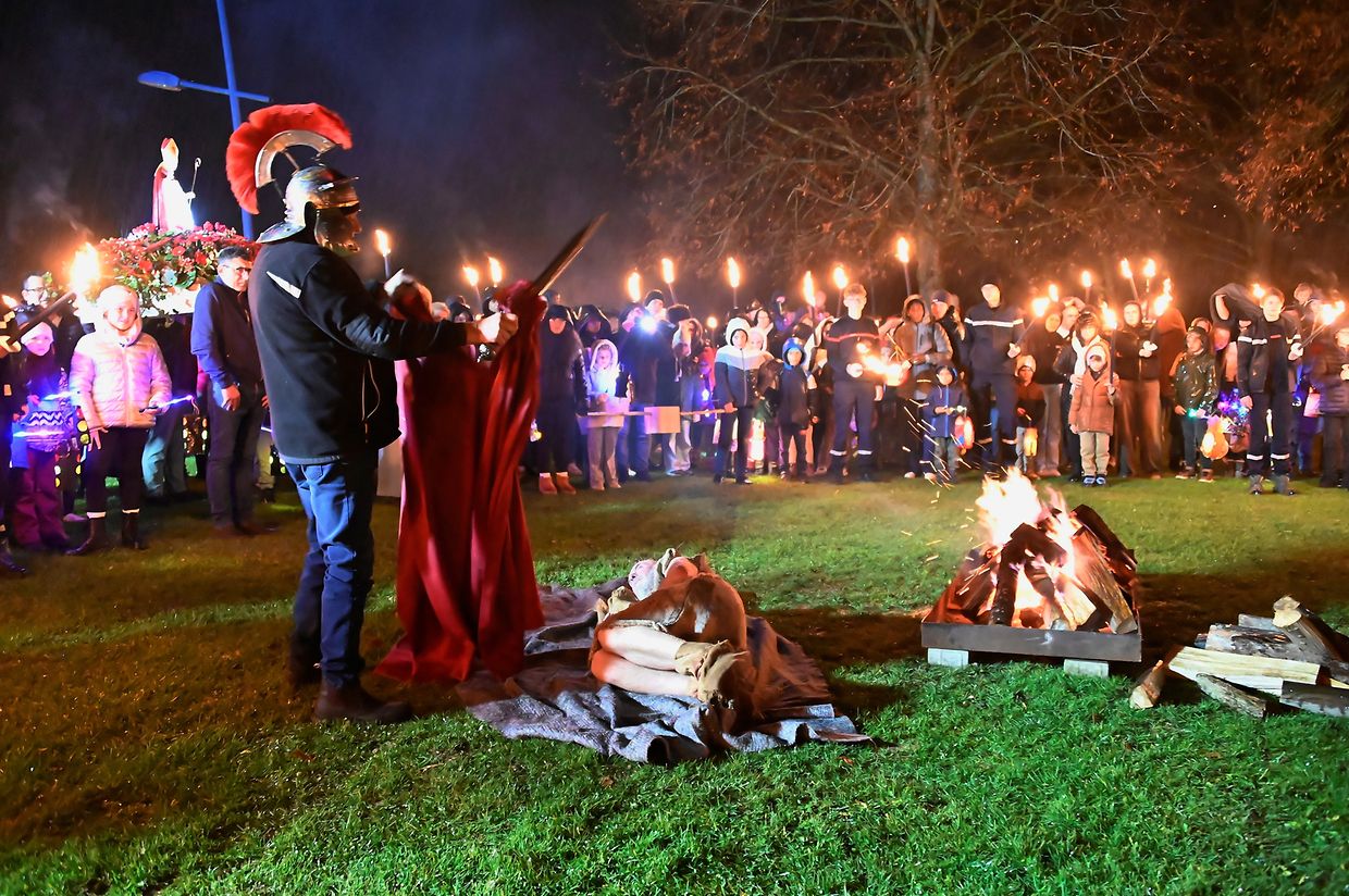 Nach der Martinsfeier im Zelt beim See in Weiswampach stellte sich der Laternenumzug auf, angeführt von St. Martin auf dem Pferd, den Jugendpompjëen, den Kindern mit den Gebeten aus der Familienkirche Wilwerdingen, des Musikvereines von Weiswampach. Neu in diesem Jahr war die Martinsstatue, die von vier portugiesischen Männern getragen wurde wie es in Portugal üblich ist. Der Laternenumzug begab sich beim Martinsfeuer, wo St. Martin seinen Mantel mit dem Bettler teilt.