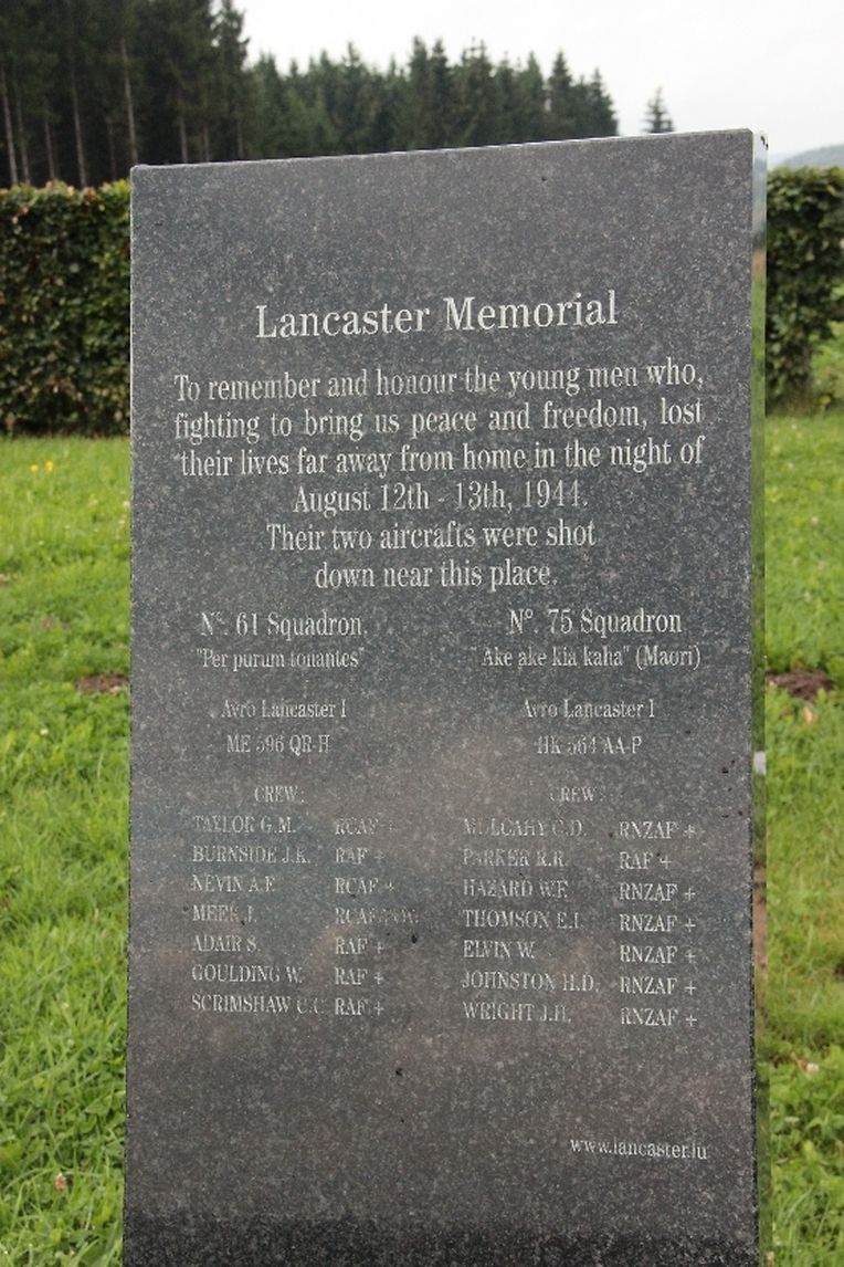 Das Lancaster Memorial befindet sich in Weiswampach direkt an der belgischen Grenze in Richtung Ouren. Dieses Denkmal wurde zu Ehren der Besatzungen der von 2 von deutscher Flak unweit dieses Denkmals abgeschossenen Avro Lancaster I Bombern errichtet. Das Denkmal besteht aus einem Gedenkstein, einer Skulptur, die einen Flügel symbolisiert sowie 14 im Boden versenkte Kreuze, die die Besatzung darstellen. Der Absturz dieses Bombers ereignete sich in der Nacht vom 12. auf den 13. August 1944. Die Besatzung der beiden Bomber bestand aus 3 verschiedenen Nationen, aus England, Neuseeland und Kanada. Tödliche Luftkämpfe die unter Zwang durchgeführt werden mussten, und die ihr Leben opfern mussten, für die wurde an jene schreckliche Nacht gedacht, und drei Blumenkränze niedergelegt.