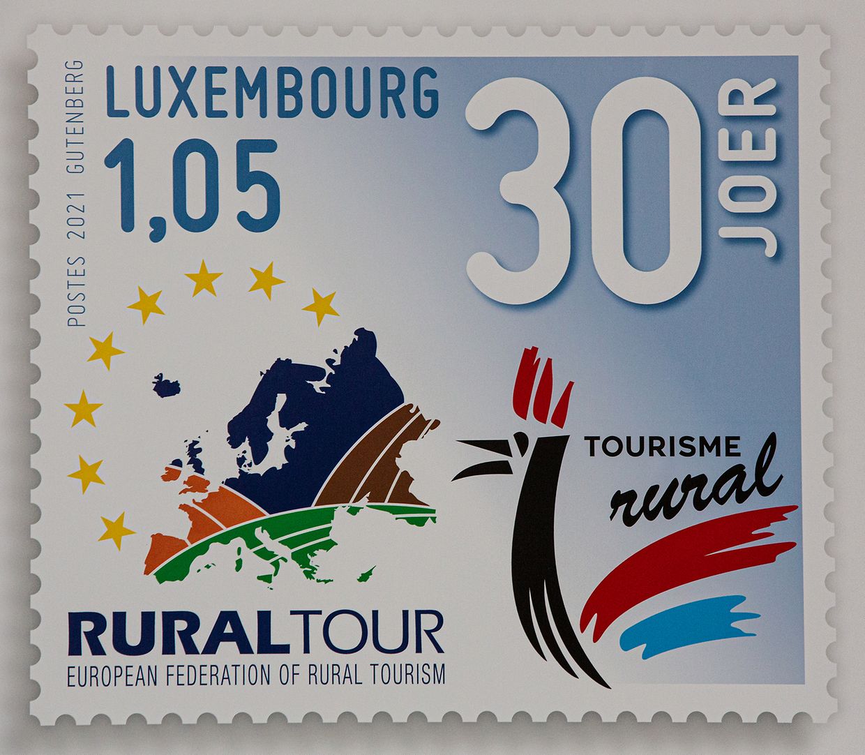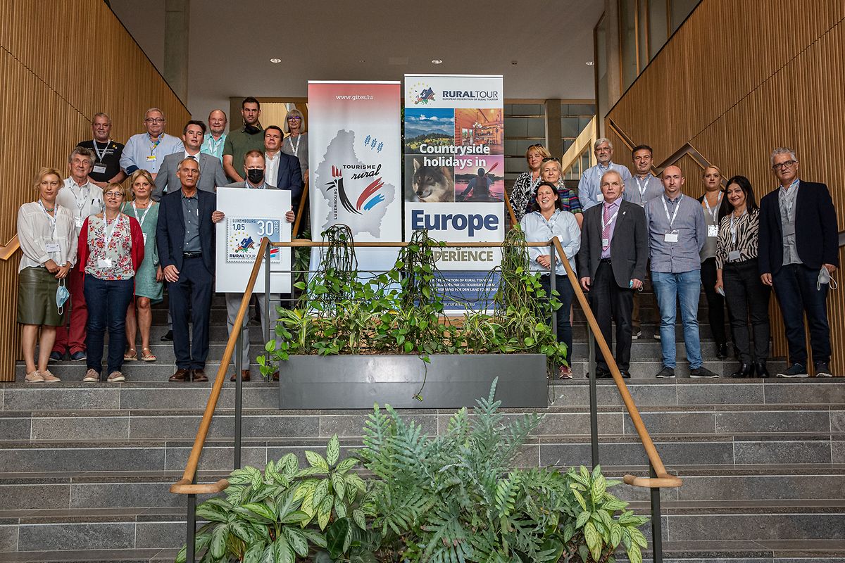 Der Dienstag war der offiziellen Generalversammlung des europäischen Dachverbandes Eurogites gewidmet. Im Gebäude von POST Luxemburg konnten die Teilnehmer im Anschluss im Beisein von Tourismusminister Lex Delles und eines Vertreters des Landwirtschaftsministeriums der offiziellen Präsentation, durch Generaldirektor Claude Strasser und Philatelie-Verantwortlichen Emile Espen, einer Gedenkbriefmarke zu 30 Jahre Tourismus im ländlichen Raum beiwohnen. Im Rahmen dieser Pressekonferenz stellte Eurogites auch die neue Identität sowie den neuen Namen der europäischen Vereinigung vor. Der 26 Länder umfassende Dachverband, bei dem die die luxemburgische APTR Gründungsmitglied ist, wird fortan unter dem neuen Namen Rural Tour geführt werden.