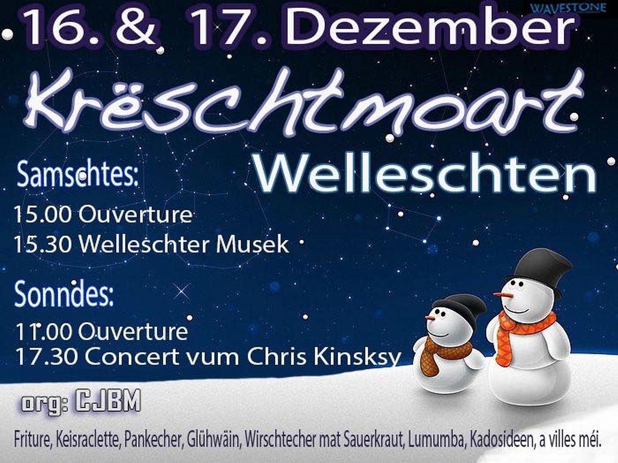 Kommt a besicht eise schéine Krëschtmoart bei der Kierch zu Wellesteen e Samschdeg 16. Dezember ab 15 Auer an e Sonndeg 17. Dezember ab 11 Auer.