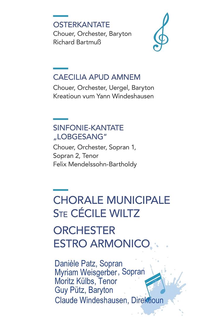 Zesumme mam Orchester Estro Armonico, de Solisten Danièle Patz, Myriam Pütz–Weisgerber, Moritz Külbs a Guy Pütz séngt d'Chorale ee besonnesche Programm mat 3 Wierker. Osterkantate vum Richard Bartmuß, Caecilia Apud Amnem, eng Creatioun fir dësen Anniversaire vum Yann Windeshausen, an de "Lobgesang" vum Felix Mendelssohn.