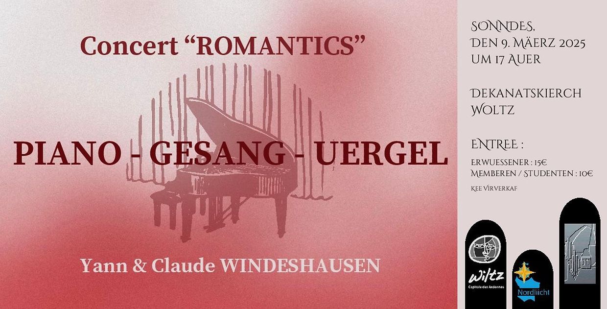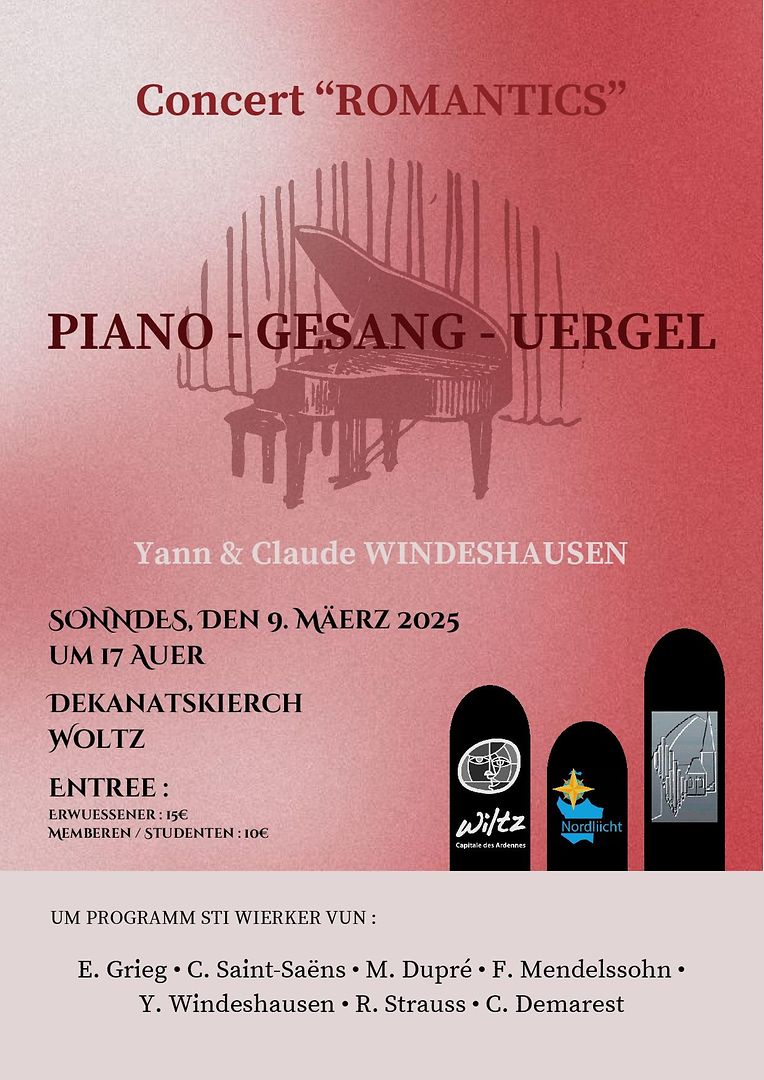 De Yann Windeshausen, aktuell Museksstudent op der Musikhéichschoul zu München, zesumme mat sengem Papp, Claude Windeshausen spillen ee Concert mat Piano, Uergel a Gesank, sonndes de 9. Mäerz um 17 Auer an der Kierch zu Nidderwoltz.