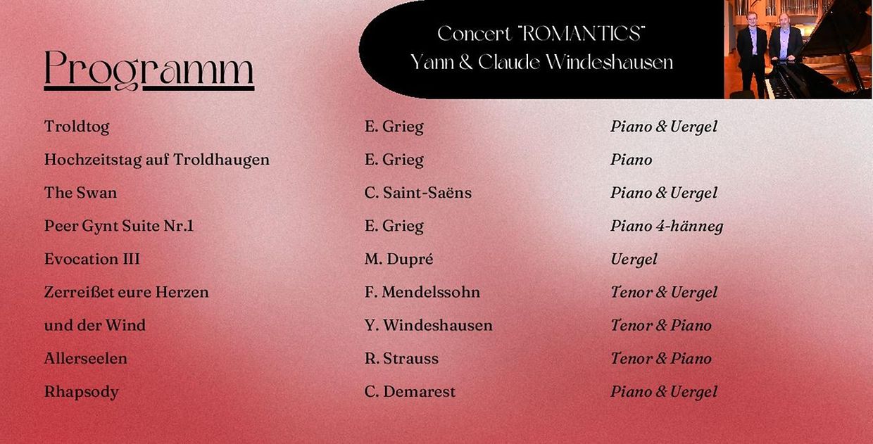 Um Programm sti Wierker an Transkriptiounen vu Grieg, Saint-Saëns, Dupré, Mendelssohn, Y. Windeshausen a Strauss.